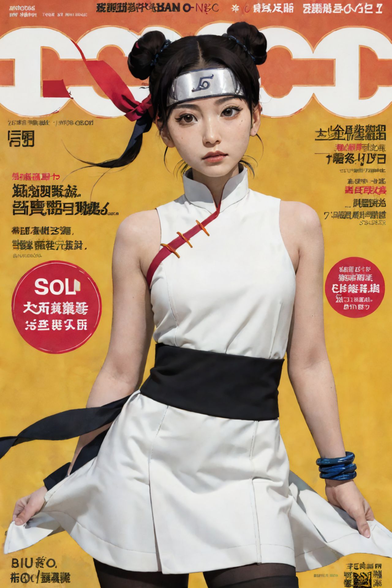 天天,《火影忍者》,這張圖片取自中國雜誌《CQ》的封面,畫面生動。畫面中心是一位自信滿滿的年輕女子。她身穿傳統的白色武術服,黑色點綴更添幾分真實感。她的頭髮綁成俏皮的雙馬尾,手中拿著一條紅絲帶,或許象徵著某個特殊場合或成就。頭上戴著一條銀色的「S」字形頭帶,可能代表某個武館或組織。醒目的黃色背景與女子的服飾形成鮮明對比,巧妙地突出了女子和雜誌名稱,使其更加引人注目。除了主體人物外,封面還包含一些文字元素,提供背景資訊和其他補充說明。然而,這些細節在描述中並未提及。從整體構圖來看,這張圖片可能與武術賽事或訓練有關。