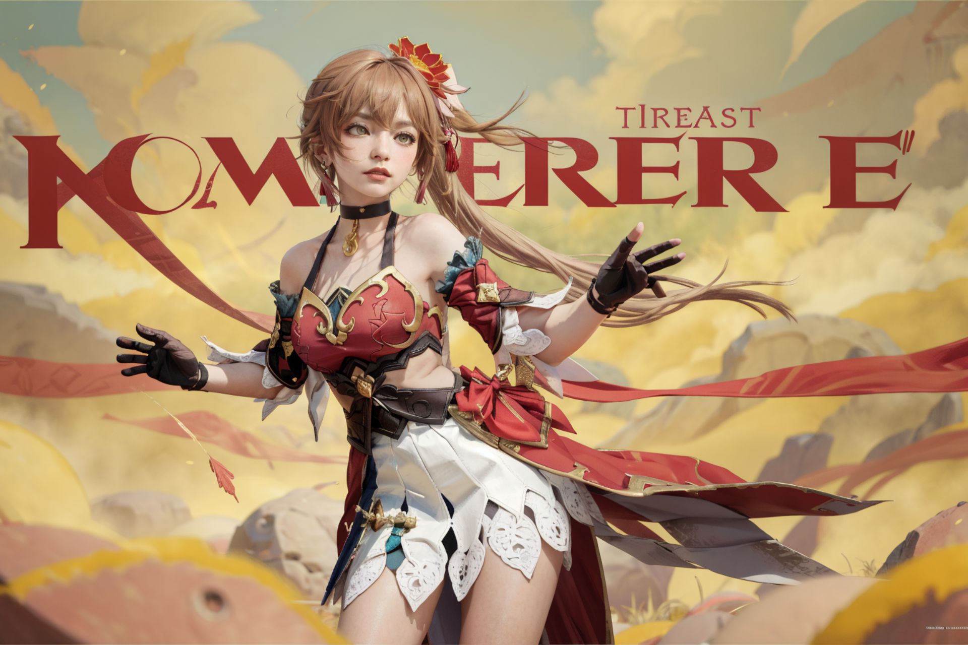 桂奈芬,崩壞星軌。畫面描繪了一位身著鮮豔紅金服飾、長髮飄飄的年輕女子。她自信地立於岩石之上,雙臂伸展,彷彿擁抱著周圍的一切。背景是暴風雨夜下嶙峋的岩石地貌,更添幾分戲劇張力。畫面上方以粗體字寫著“Tiera”和“Komerce”,可能表明了藝術家或作品名稱。