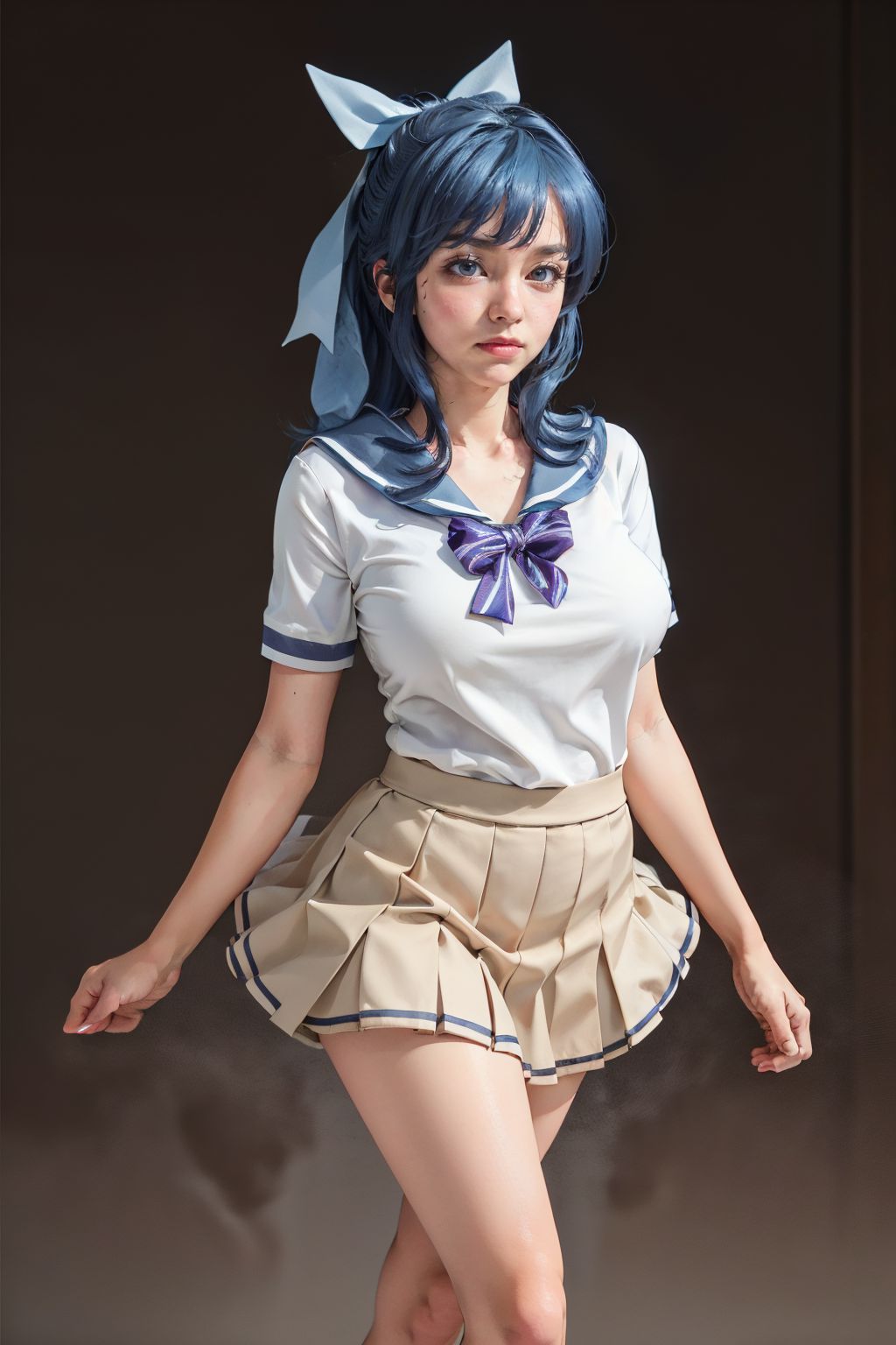 萩浦由奈三社麵團。照片中是一位年輕女孩,她留著藍色波波頭,頭上繫著同色系的藍色蝴蝶結。她身穿白色水手服,紫色領子和腰帶為整體造型增添了一抹亮色。制服包括一條米色裙子,裙子上放著一個藍色小包,與她髮帶的顏色相呼應。女孩自信地站在純黑色的背景前,目光看向一旁,似乎在沉思,或是專注於畫面之外的事物。她的姿態沉穩放鬆,一隻手隨意地放在臀部,另一隻手輕輕地放在大腿上。儘管畫面簡潔,卻充滿了講述故事的細節——從女孩的裝束暗示她可能隸屬於某個學校或組織,到她自信的姿態。這是一張定格瞬間的照片,卻蘊含著無限的敘事可能。