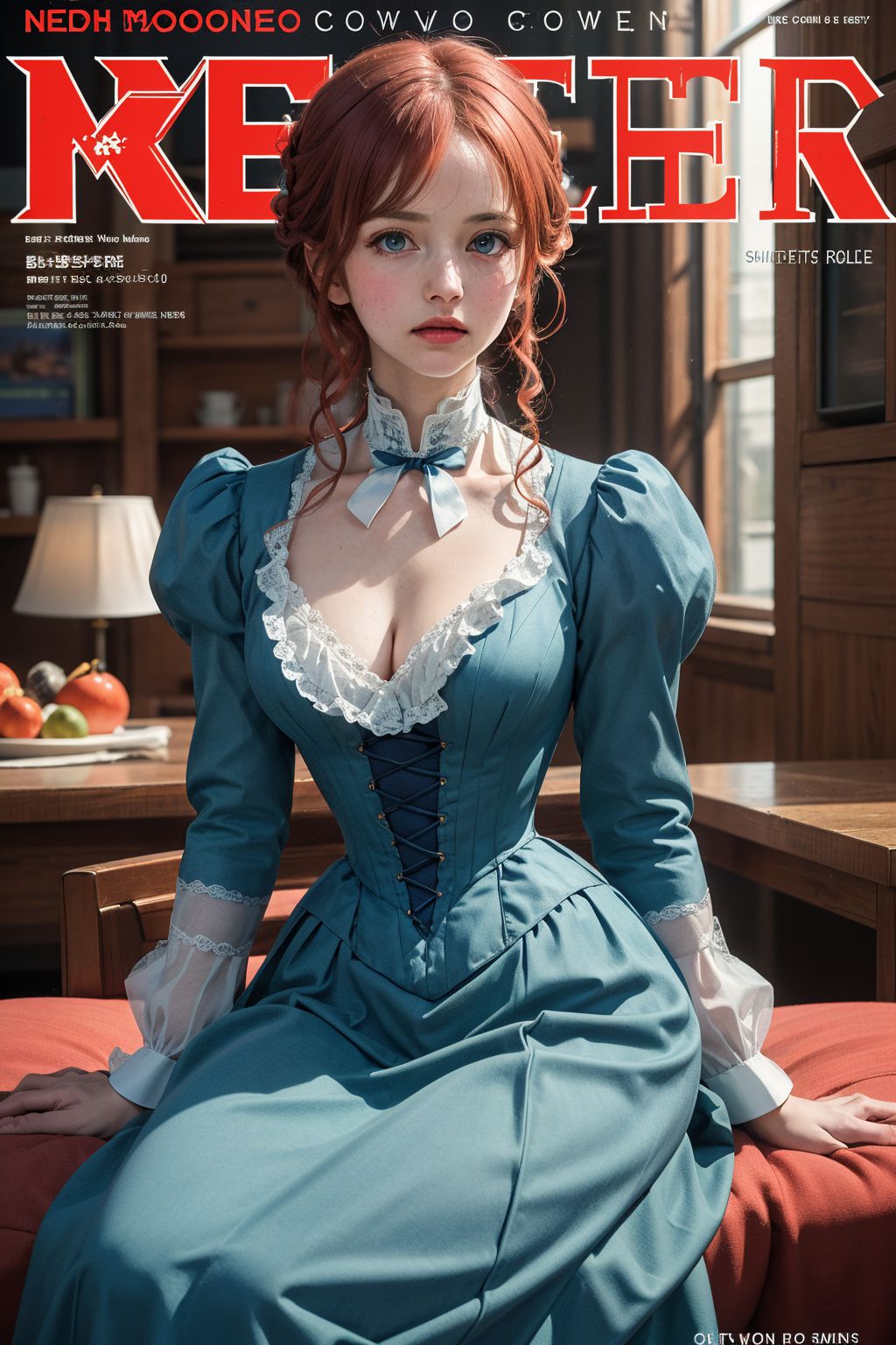 維多利亞時代的服飾。這張圖片是一本名為《珍藏》(Keepsake)的雜誌封面。畫面主體是一位年輕女子,她有著鮮豔的紅髮,身穿藍色長裙。她坐在室內一張木凳上,環境類似圖書館或書房。背景中擺滿了書架和一扇窗戶,營造出一種寧靜而充滿學術氣息的氛圍。女子的目光直視鏡頭,與觀者產生一種互動感。她的姿態和表情放鬆又不失沉穩,更增添了畫面整體的寧靜氛圍。除了主體之外,還有一些元素共同構成了雜誌封面的主題和敘事。畫面中可以看到「NEDH MOONEROSE COVCO」字樣,這可能暗示著雜誌的標題或某個重要的細節。 「KEEPER」一詞多次出現,可能與雜誌名稱、女子在故事中的角色或其他重要元素有關。此外,畫面中還包含一些小物件和細節,例如蘋果、杯子和書。這些元素為畫面增添了深度,提供了關於場景和主角生活方式的背景資訊。整體而言,這張圖像呈現了一個圍繞著知識追求、個人風格和寧靜氛圍的故事。女子的藍色長袍、木質長椅以及室內圖書館般的環境都為這一敘事做出了貢獻,共同構成了一個連貫的視覺故事,並留給觀者自由解讀的空間。