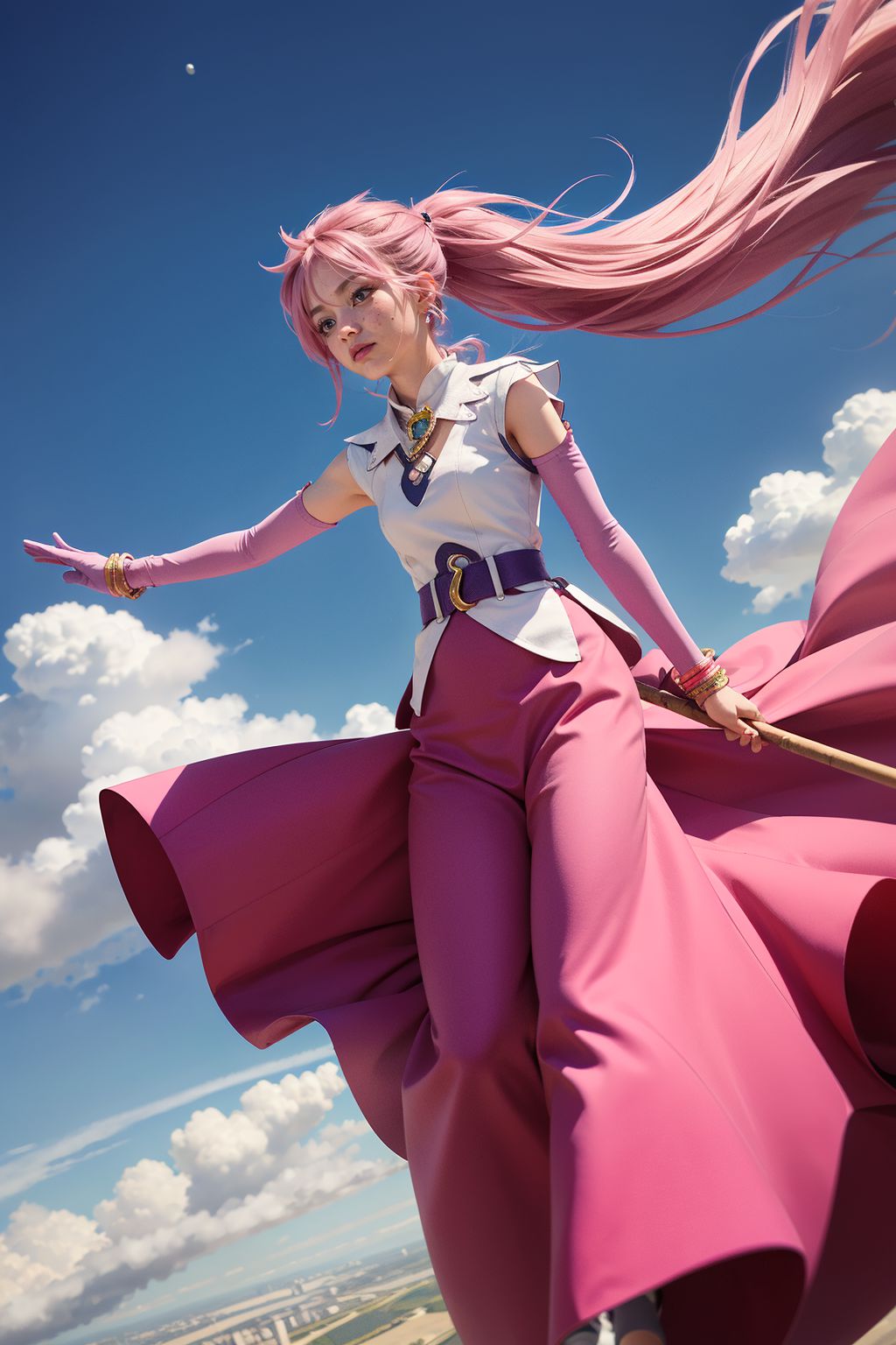 在蔚藍的天空下,點綴著朵朵白雲,一個身影在背景中格外醒目。她並非尋常之人,而是身著與天空色彩相呼應的艷麗服飾-粉紫相間。一頭粉紅色長髮如瀑布般傾瀉而下,更添幾分艷麗。她位於畫面中央,瞬間吸引了所有人的目光。她手中握著一根粉紅色的桿子,與她的服飾和周圍的天空形成鮮明的對比。她的目光向下,彷彿陷入沉思,或許正在思考下一步該怎麼做。她的姿態充滿動感,彷彿正邁著輕快的步伐,為畫面增添了一抹活力。畫面中沒有任何文字或可辨識的物體,所有的焦點都集中在這位中心人物以及她在寧靜天空映襯下令人驚豔的身影上。