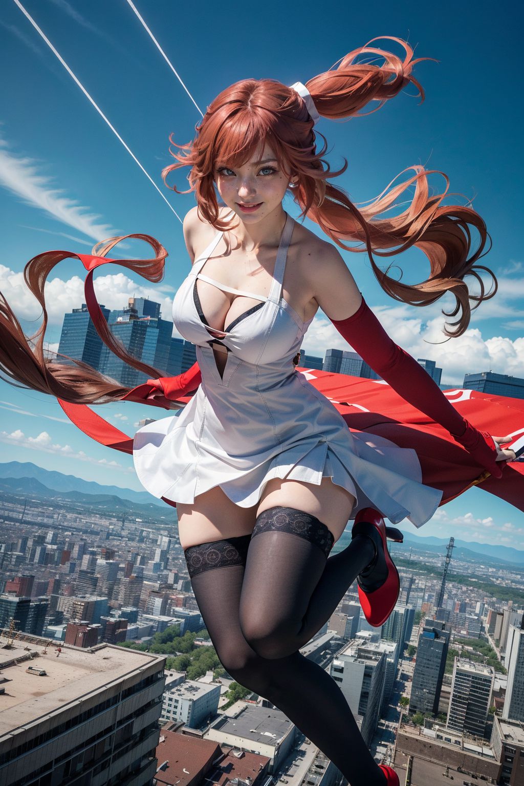 昌利,《呼嘯海嘯》中的融合自然共振器。在繁華都市的中心,湛藍天空的遼闊之下,一位擁有鮮豔紅髮的年輕女子佇立於此。她身穿一襲白色長裙,胸前醒目的紅色V字領和與之相配的紅色披風在她身後飄揚。長長的棕色瀏海遮住了她的雙眼,她凝視著遠方。周圍的城市景觀描繪出一幅都市生活的畫卷——高樓林立,道路熙熙攘攘。然而,這並非一座普通的城市。這是一座未來之城,科技與自然在此和諧共存。天空中點綴著飛行車,它們流暢的線條和充滿未來感的外觀在陽光下閃閃發光。女子獨自佇立於這科技奇蹟之中,卻絲毫不顯格格不入。相反,她與周圍的一切完美融合,成為這座城市脈動和韻律的一部分。她彷彿不只站在屋頂上,而是翱翔於大地之上,擺脫了地心引力的束縛。這幅畫面中的每個元素都完美融合,創造出一個既平凡又非凡的場景——一個日常瞬間被定格,背景則是科技與魔法並存的世界。
