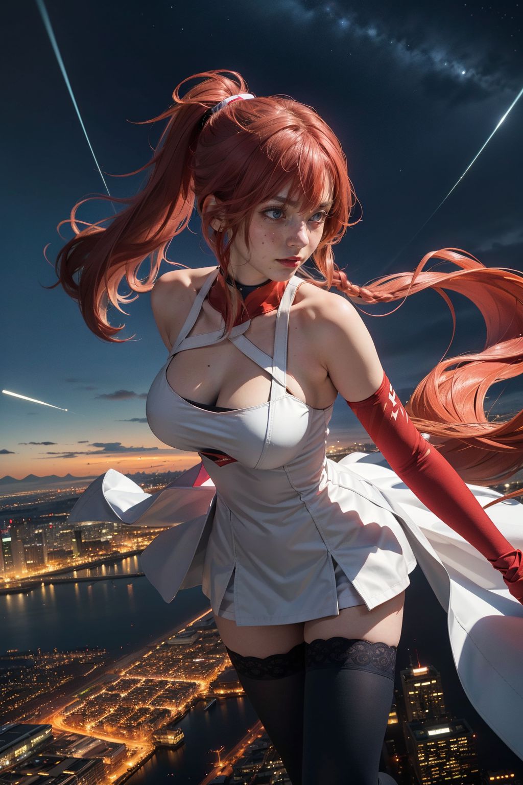 昌利,呼嘯海中的融合自然諧振器,一個有著豐滿紅色乳房的女孩站在城市天際線前。