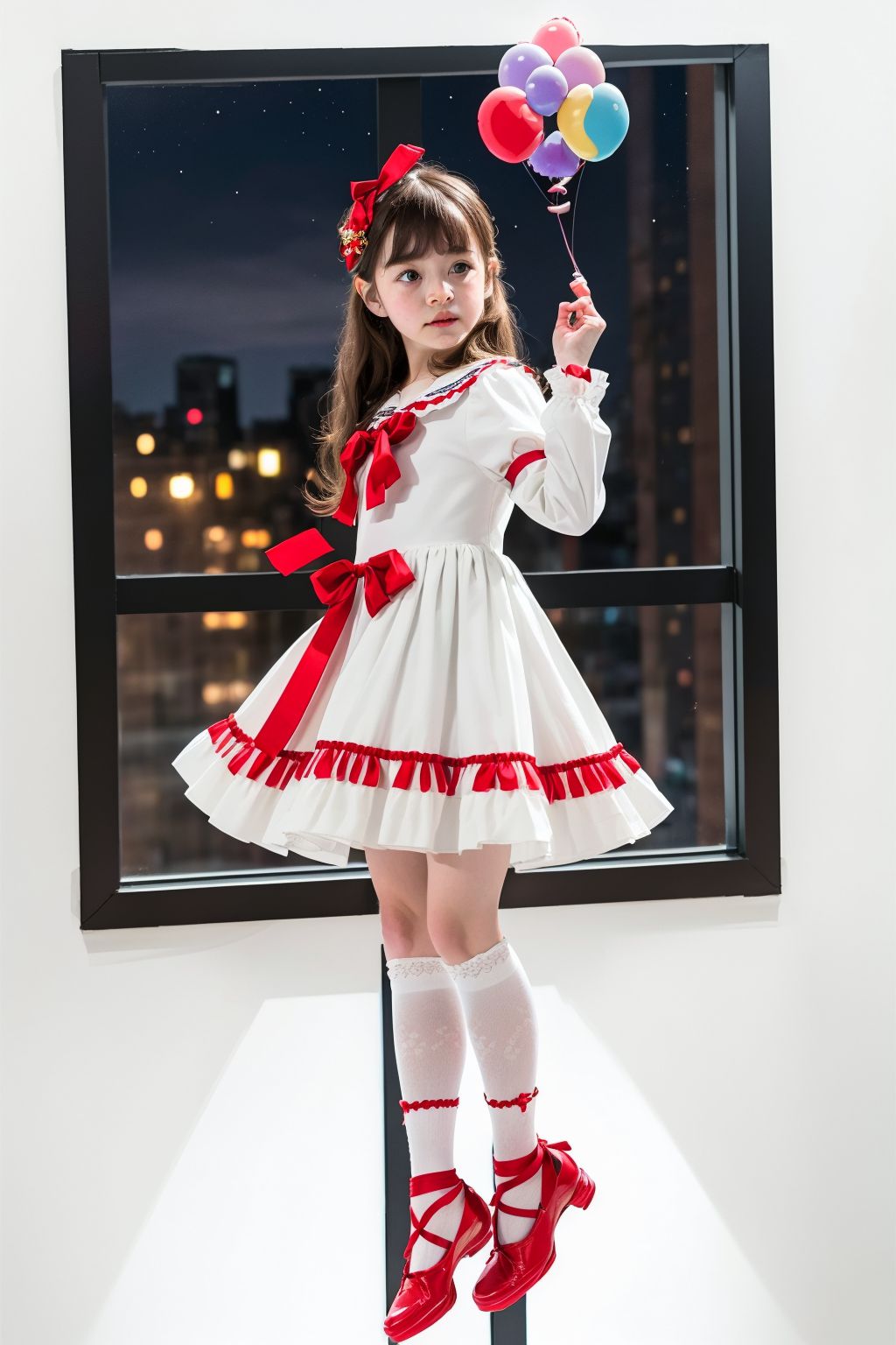 夢遊女孩 圖片中心人物是一位年輕女孩。她穿著白色連身裙,點綴著紅色元素,包括頭上的蝴蝶結和與之相配的紅色鞋子。女孩手中拿著一個粉紅色、紫色和藍色相間的氣球。她的目光看向畫面右側。場景似乎是一間房間,女孩身後有個窗戶。透過窗戶,可以看到夜晚的城市天際線,五彩繽紛的燈光照亮了城市。女孩在窗前的姿勢表明她可能正在眺望城市,或在幻想未來的冒險。請注意,圖片中沒有任何可辨認的文字,我對物體的相對位置的描述已盡我所能,根據提供的圖片描述。