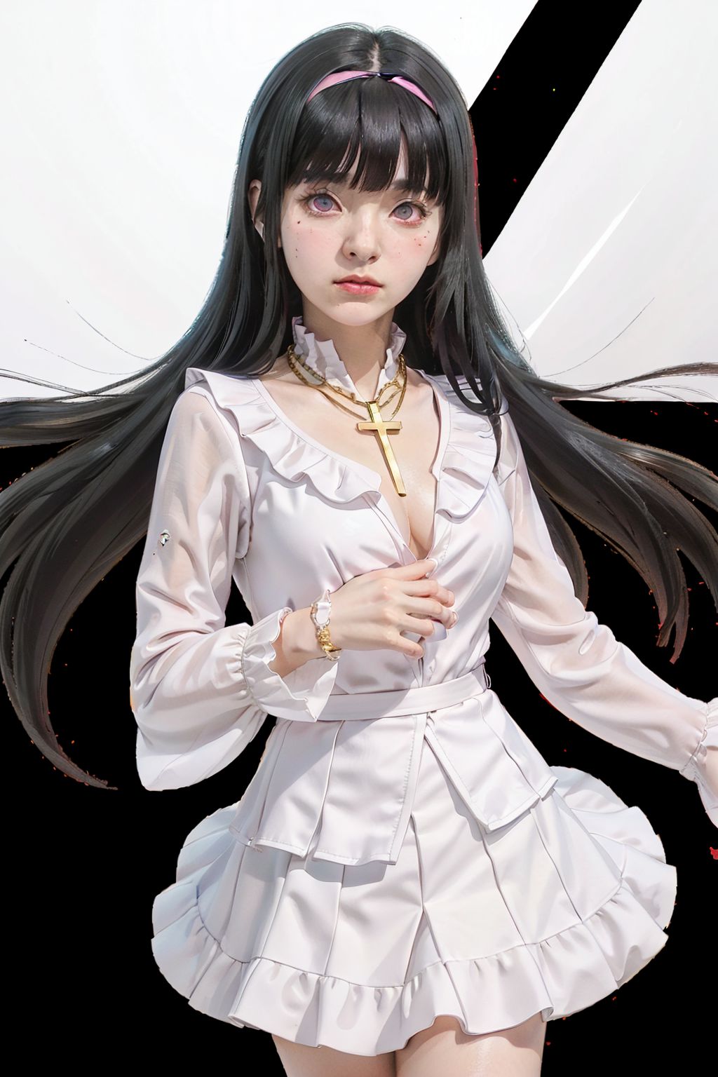 安妮(《食戟之靈》)的這幅畫作,以白色背景為襯托,畫面中央是一位長髮飄飄的少女。少女的秀髮如瀑布般傾瀉而下,粉紅色的髮帶為她增添了一抹亮色。她身穿白色連身裙,領口飾有荷葉邊,更顯優雅。一條金色項鍊點綴著她的頸項,與白色連身裙相得益彰。少女手中握著一個白色的小物件,其用途和身份在畫面中並不清晰。少女的目光看向一旁,臉上帶著一絲微笑,為整幅畫增添了一抹溫暖。簡潔的背景使觀者的視線完全集中在少女身上,突顯了她的五官和服飾。畫面中沒有任何文字或其他物體。少女位於畫面中心,她的服飾和頭髮佔據了畫面的大部分空間。由於畫面中的物體保持靜止,因此無法提供關於它們動作的資訊。圖片主要顏色為白色(她的服裝和背景)、黑色(她的頭髮)和粉紅色(她的髮帶)。此描述基於圖片中可見的元素,不包含任何推測或虛構內容。它詳細描述了圖片,重點是物體類型、顏色、數量、動作、位置和文字。