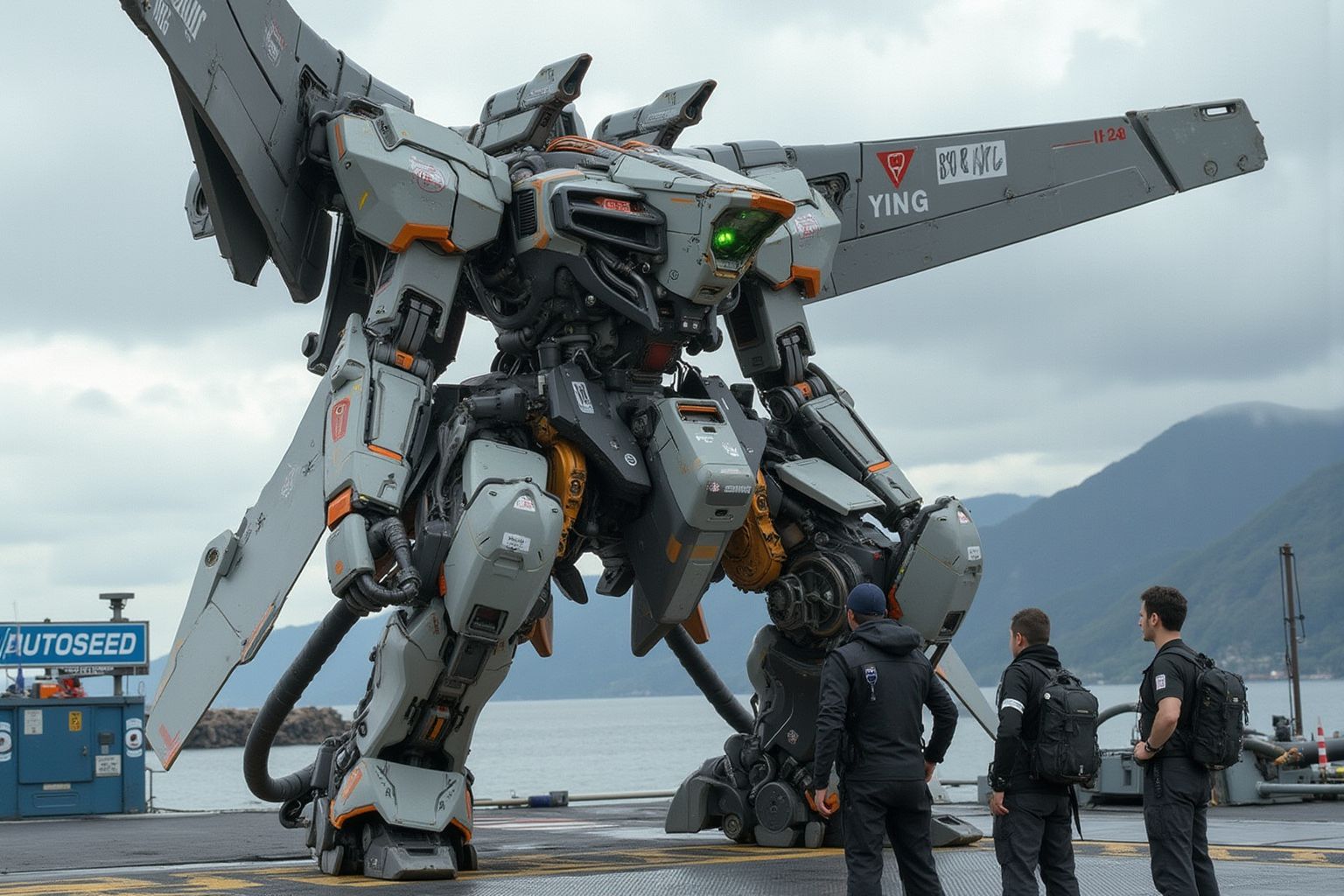 逼真的機器人。這幅畫面捕捉了機場上一個扣人心弦的場景。畫面中央是機器人,其金屬色調與橘色和黑色點綴交相輝映,更顯威武雄壯。機器人的頭部特別引人注目,一隻碩大的綠色眼睛彷彿正注視著周圍的一切。在機器人右側,與這隻機械身軀形成鮮明對比的是兩位身著便服的人物。他們的出現為這非凡的場景增添了一絲日常生活的氣息。機場背靠雄偉的山脈,山峰籠罩在薄霧之中,為畫面增添了一抹空靈之感。附近有一片水域,水面平靜無波。機器人底座周圍散落著各種設備,它們默默地見證著眼前發生的一切。它們的具體功能或用途尚不明確,但它們共同營造出一種貫穿整幅畫面的期待與驚奇的氛圍。儘管存在這些元素,畫面中卻沒有任何可辨識的文字,這使得解讀完全取決於觀者的想像。物體之間的相對位置——左側的機器人、右側的人物以及散落在底座周圍的設備——在構圖中創造了一種平衡感。整幅畫面散發出一種引人入勝的神秘感,讓人不禁想要探索這一刻背後的故事。
