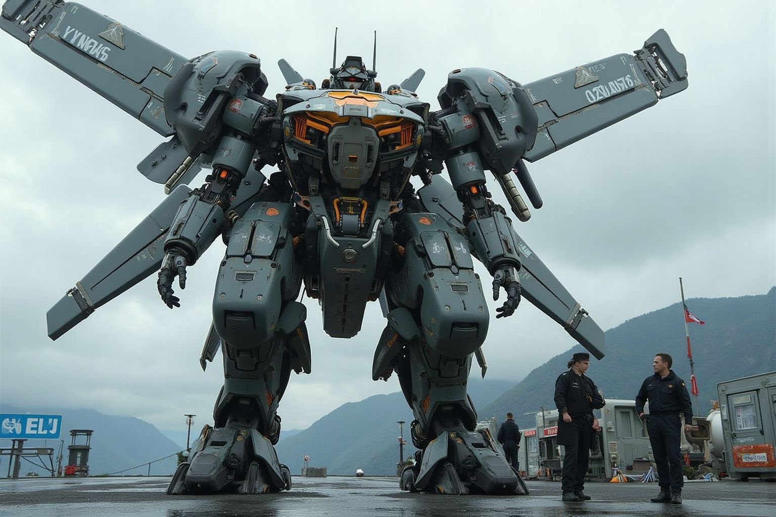 逼真的機器人。這幅畫展現了軍事力量在山巒環繞下展現的壯麗景象。前景中,一座巨大的機器人巍然屹立於灰色混凝土平台上。機器人塗裝成黑色和橙色,配備多條機械手臂和腿部,氣勢磅礴。機器人附近站著兩個人,他們的目光似乎都被機器人的雄偉吸引。一人站在機器人右側,另一人則位於左側,構圖平衡和諧。機器人所在的平台前方是一座白色建築,建築上裝飾著藍色的標誌和橫幅,為原本單調的畫面增添了一抹亮色。遠處,雄偉的山脈綿延至天際,山峰籠罩在薄霧之中。機器人的機械感與山脈的自然美景形成鮮明對比,增強了畫面的層次感。這張照片以低角度拍攝,突顯了機器人和人物的體量,使他們在身後廣闊的景色映襯下顯得格外高大。這個視角也使得機器人的精巧設計和結構一覽無遺。整體而言,這幅畫面展現了科技與自然、人類存在與宏偉壯麗的並置,所有這一切都呈現在同一畫面之中。它捕捉了人造奇蹟與自然世界和諧共存的瞬間。