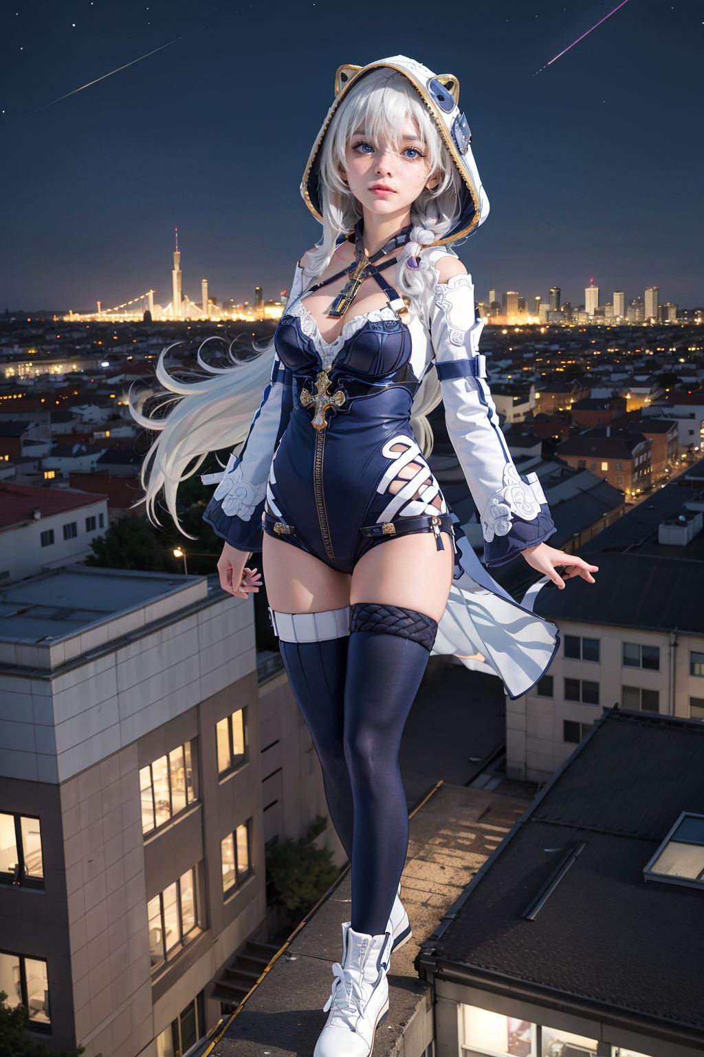 特蕾莎的命運無法逃脫。夜色靜謐,一位女子佇立於樓頂。她一頭飄逸的白髮與藍白相間的衣裙相得益彰。衣裙上點綴著金色飾物,在城市燈光的襯托下熠熠生輝。她右手握著一個小物件,用途不明。她身後的城市景觀點綴著高樓大廈和一座塔樓,它們的輪廓在夜空中高聳入雲。城市燈光照亮了這幅景象,投下長長的影子,光影交錯,形成鮮明的對比。儘管背景是熙熙攘攘的城市,但這一刻卻瀰漫著一種寧靜祥和的氣息。畫面中沒有任何可辨識的文字或可計數的物體。女子在樓頂的位置是畫面的中心,她的目光投向畫面之外的某個地方。物體的相對位置暗示著都市環境,女子所處的高度高於她身後的城市景觀。這種構圖可能暗示著沉思或內省。畫面細節不足,無法準確判斷具體動作或物件位置。然而,整體構圖暗示著一個開放式的敘事,引人遐想,讓人不禁思考這瞬間背後隱藏的故事。