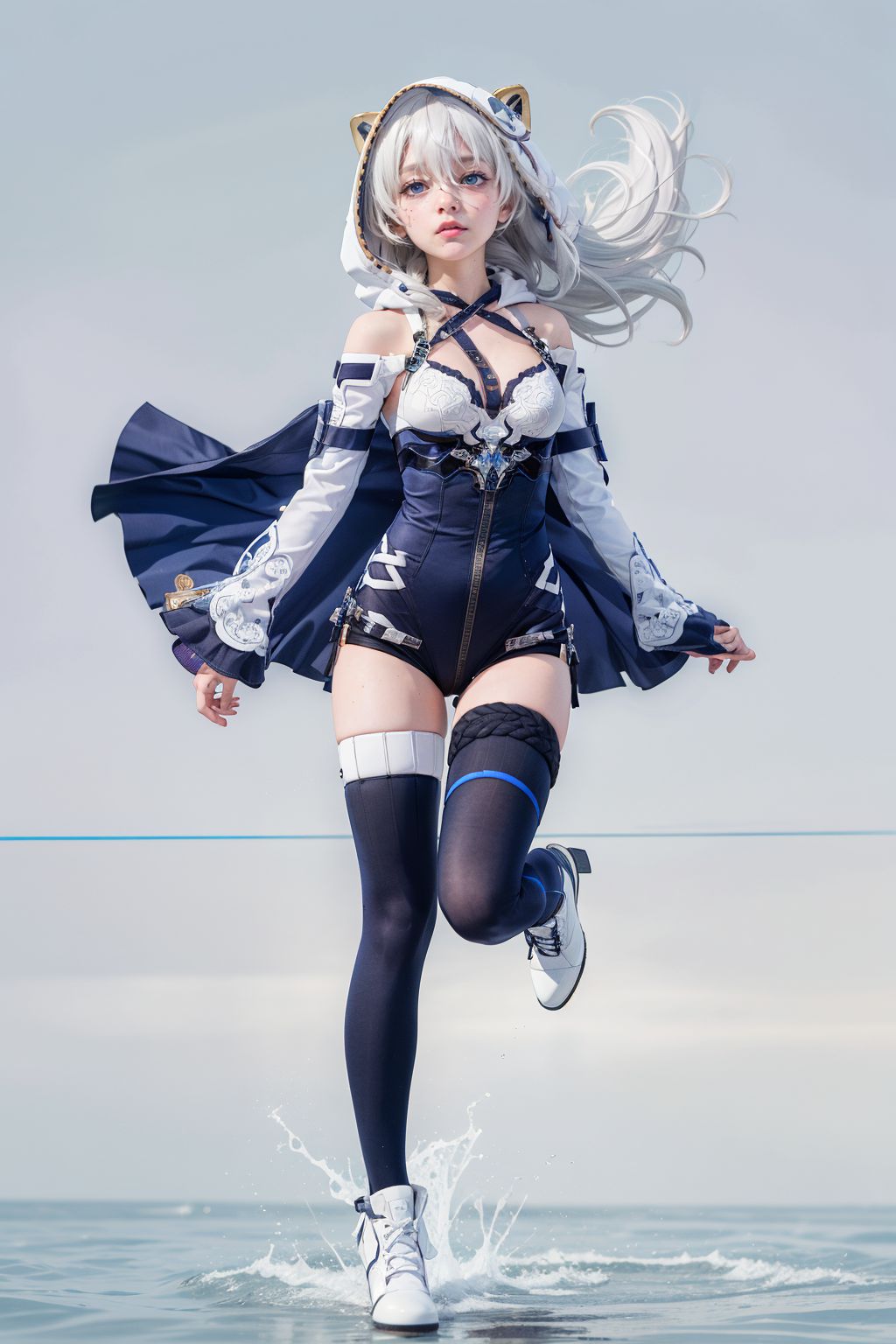 特蕾莎的命運無法逃脫。畫面中央,一位留著齊劉海的白色長髮年輕女子是主體。她穿著藍色套裝,包括胸罩、襯衫和短褲,搭配黑色過膝襪和白色靴子。她手中撐著一把藍白相間的陽傘。背景是一片寧靜的水面,女子單腳站立,目光看向一旁。她的姿態充滿動感,彷彿正要登上或離開一艘看不見的船。照片只捕捉了她的腰部以上,突出了她的裝束和表情。背景雖然模糊,但仍展現出一片寧靜的景象:湛藍的天空,碧波蕩漾,增強了照片的整體構圖。