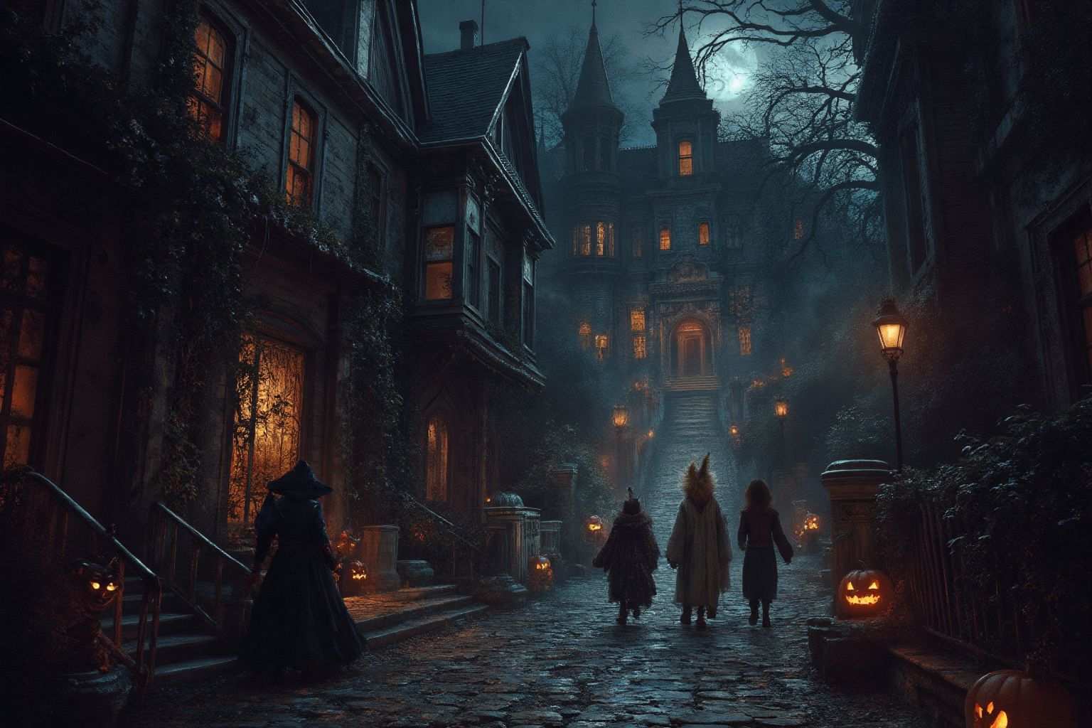 照片中,四個人在夜色掩映下沿著鵝卵石街道行進。每個人都穿著奇裝異服,其中最引人注目的是裝扮成女巫和南瓜的人。他們背對著鏡頭,朝著遠處高聳的大樓走去。街上點亮的南瓜燈散發出詭異的光芒,為畫面增添了一抹神秘感。這些燈籠,加上透過樹蔭灑下的月光,投下長長的影子,營造出畫面的縱深感。他們行走的鵝卵石街道為畫面增添了一絲古樸的韻味,而遠處高聳的大樓則暗示著都市的氛圍。整幅畫面的構圖營造出一種節日般的萬聖節氛圍。