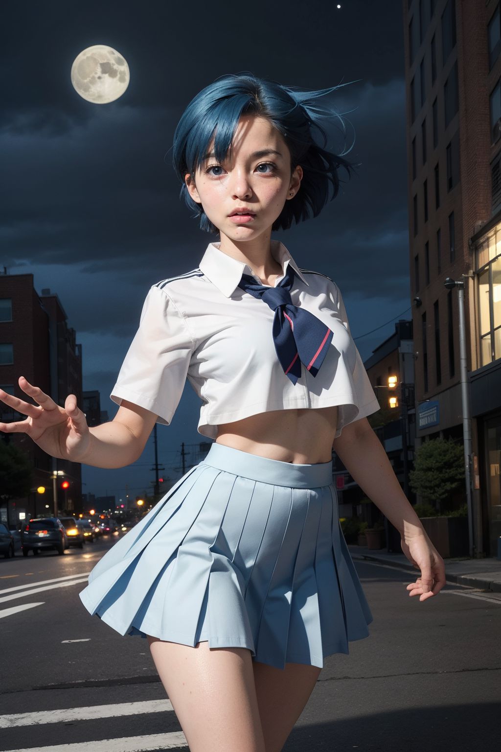 在靜謐的夜色中,一位年輕女孩佇立於城市街道中央。她身穿白色襯衫,與藍色裙子和同色髮飾形成鮮明對比。她目光側向一旁,臉上流露出淡淡的憂傷或渴望。周圍的城市景象熙熙攘攘,燈火通明,高樓大廈直插夜空。她身後的街道上,車輛整齊地停放在路邊。路燈柔和的光芒灑滿整個畫面,投射出長長的影子,更添幾分景深。遠處,一輪滿月高懸於樓宇之上,為這喧囂的城市景象增添了一抹寧靜。儘管女孩面露憂傷,但這一刻卻蘊含著一種獨特的美。這幅畫面融合了都市生活與個人情感,講述著一個超越語言的故事。