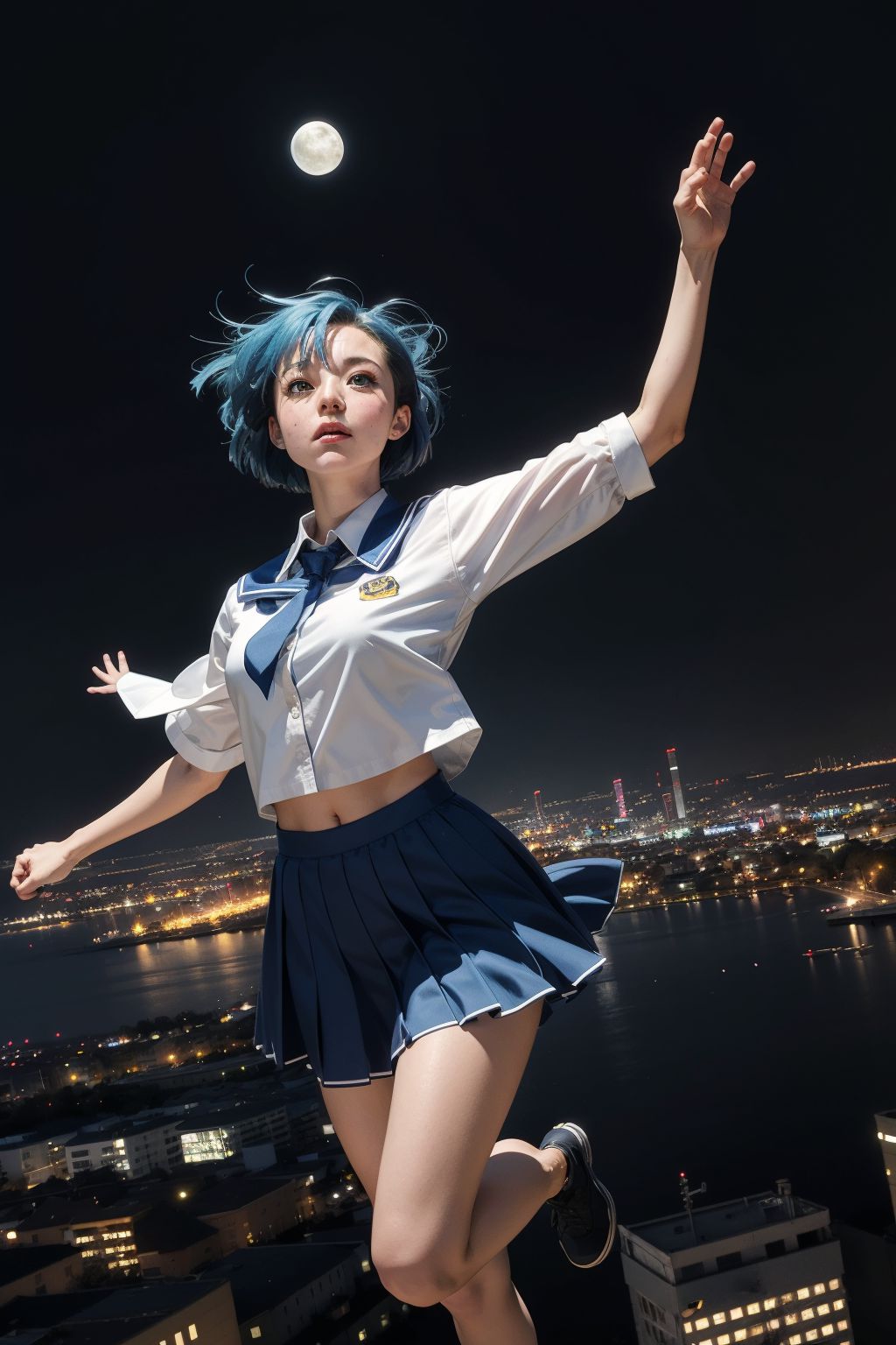 在夜幕降臨的城市靜謐中,一位藍髮少女身穿與藍色相呼應的藍色短褲和白色襯衫,襯衫左側飾有金色徽章。她張開雙臂,彷彿擁抱著周遭的世界。她自信地站在屋頂上,目光凝視著高懸夜空的滿月。腳下的城市被無數燈光照亮,即使在黑暗中也描繪出一幅生氣勃勃的景象。這瞬間定格,見證了少女的勇氣,在月光皎潔的夜空下,她獨自一人,卻無所畏懼。
