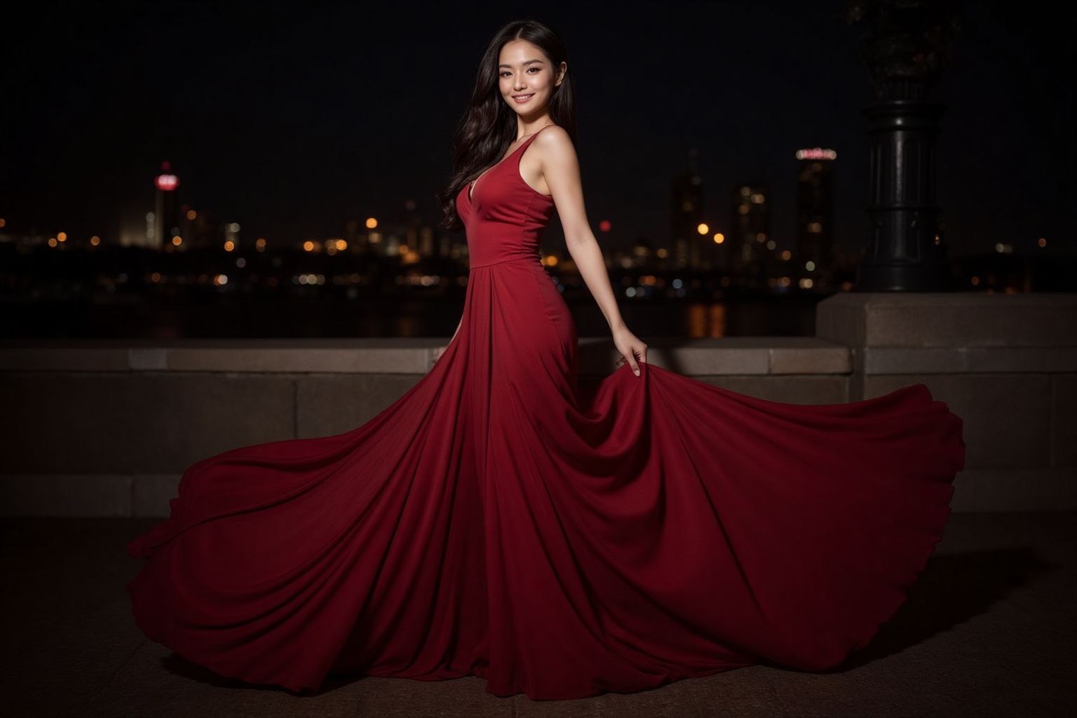 紅裙 在夜空下靜謐的城市中,一位年輕女子獨自佇立於屋頂之上。她面帶微笑,目光投向鏡頭,散發著自信與喜悅的氣息。她身著一襲鮮豔的紅色長裙,裙擺如瀑布般傾瀉而下,在她身後形成拖曳的裙裾,宛如舞池中的舞者——一場動感與色彩的盛宴。城市天際線在她眼前綿延展開,無數燈光閃爍,如同星星點點。遠處的燈光映照著高樓大廈,為這幅畫面勾勒出一幅如詩如畫的背景。它們高聳而靜默,窗戶在夜色中顯得格外幽暗。儘管身後是熙熙攘攘的城市,她卻獨自站在屋頂上,與廣闊的都會景觀形成鮮明的對比。畫面中沒有任何文字或可辨識的動作,所有的焦點都集中在女子身上,以及她在夜色籠罩的城市輪廓中散發出的耀眼光芒。