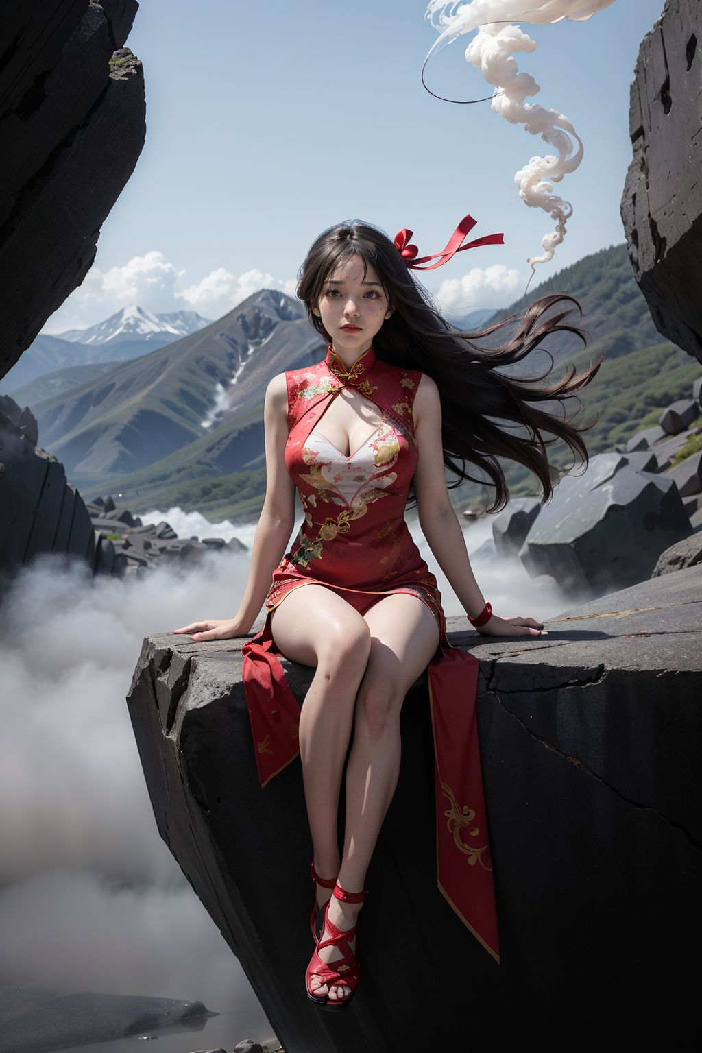 山巒幻影:畫面中,一位年輕女子端坐在懸崖上方。她穿著傳統中國服飾,包括一件鮮豔的紅色連身裙和與之相配的鞋子。一頂飾有流蘇的紅色頭飾點綴著她的秀發,更添民族風情。她所坐的懸崖呈灰色,嶙峋崎嶇,暗示著一片岩石嶙峋的地形。這與湛藍天空下白雪皚皚的山脈形成了鮮明的對比。她的腰間繫著一條紅色絲帶,或許象徵著某個特殊的場合或事件。更添幾分神秘感的是,一條白色的絲帶在她身後飄浮,彷彿擺脫了地心引力。女子的目光投向遠方,臉上帶著沉思的神情,彷彿沉浸在眼前壯麗景色的沉思之中。畫面中沒有任何可辨識的文字或可計數的物體。從物體的相對位置來看,女子位於前景,而山脈則位於遠處。