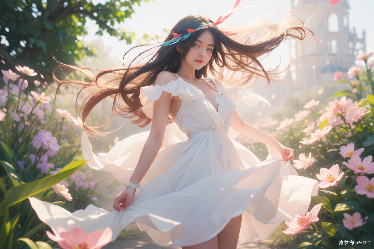 花之女神:在生機盎然的花園中心,一位年輕女子身著一襲白裙,棕色長髮如瀑布般傾瀉而下,劉海輕柔地垂在臉頰兩側,成為畫面的焦點。她頭戴紅色髮帶,與秀髮交相輝映,美不勝收。她漫步在花園,白色長裙隨風輕拂,裙子在身後飄揚。花園本身色彩斑斕,粉紅色和紫色的花朵競相綻放,更添生機。陽光燦爛,在地面上投下斑駁的光影。遠處隱約可見一座城堡,為這寧靜祥和的景色增添了一絲神秘與宏偉。畫面中的每個元素都完美融合,共同描繪出一幅充滿歡樂與美麗的畫卷,彷彿時間都為這美景駐足欣賞。