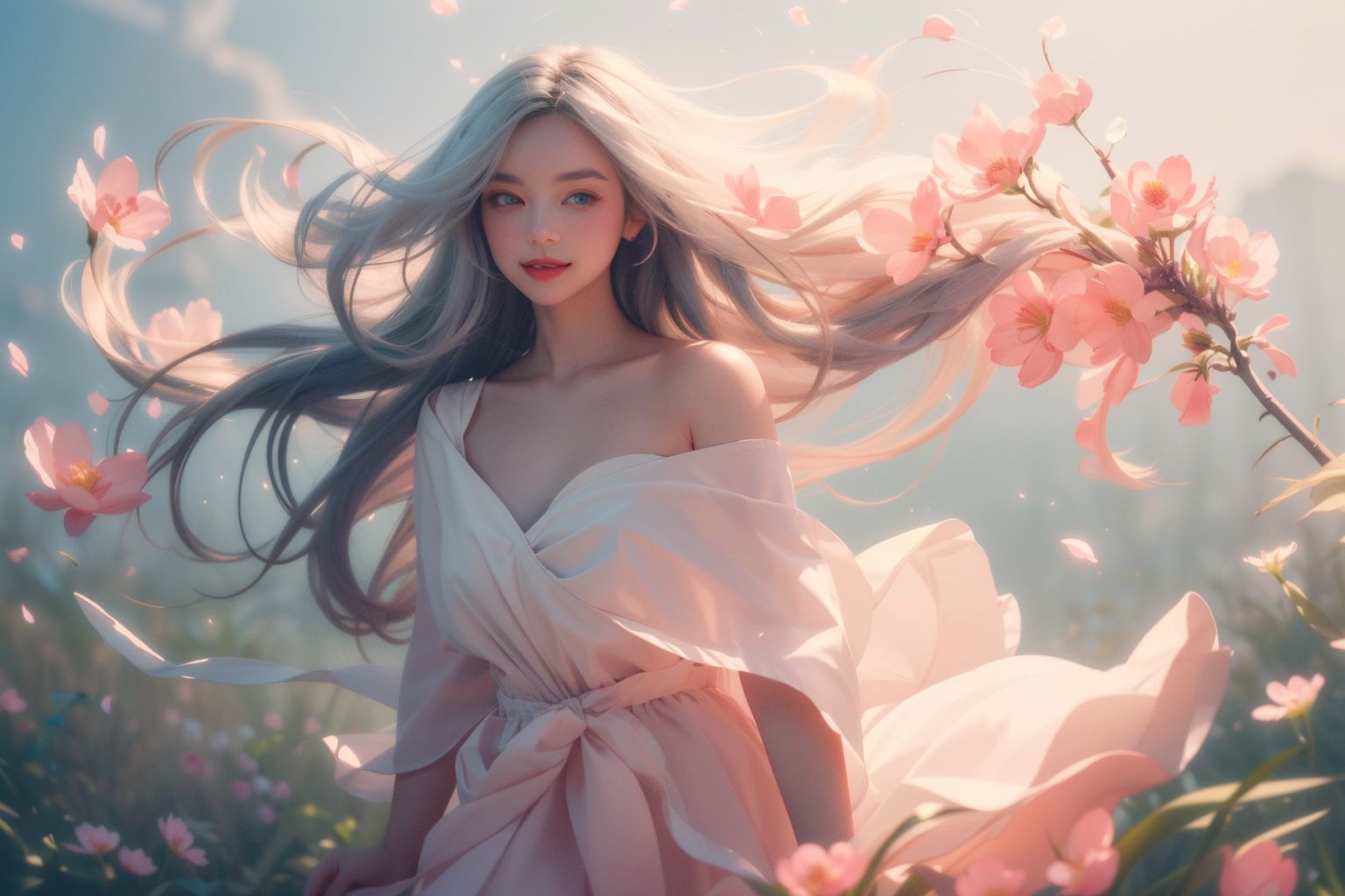 花之女神:畫面中,一位長髮飄逸的年輕女子靜靜地展現著她寧靜之美。她身著一襲白色長裙,裙擺垂至腳踝,為畫面增添了一份空靈感。她披散的長髮,與周圍自然的野性相映成趣。她端坐於一片粉紅色花叢中,嬌嫩的花瓣與身後崎嶇的山巒形成鮮明對比。背景是碧空如洗的山,彷彿在訴說著遠離塵囂的寧靜與靜謐。女子的目光看向一旁,或許沉浸在思緒中,或許只是在欣賞美景。她臉上洋溢著平和與滿足,更強化了畫面的整體氛圍。儘管畫面中包含眾多元素,卻絲毫不顯雜亂。相反,女子、長裙、花朵和風景,每個部分都和諧統一,構成了一幅賞心悅目、引人深思的畫面。圖像中沒有任何可辨識的文字或可計數的物體,所有描述的動作都是推斷而非直接觀察到的。物體的相對位置使得女子位於前景,花朵在她下方,山脈在背景中。這樣的佈局突顯了女子作為中心人物的地位,同時也使其他元素各司其職,共同構成一個和諧的整體。圖像沒有提供任何可用於判斷虛構內容的信息,所有描述都完全基於圖像中可見的元素。