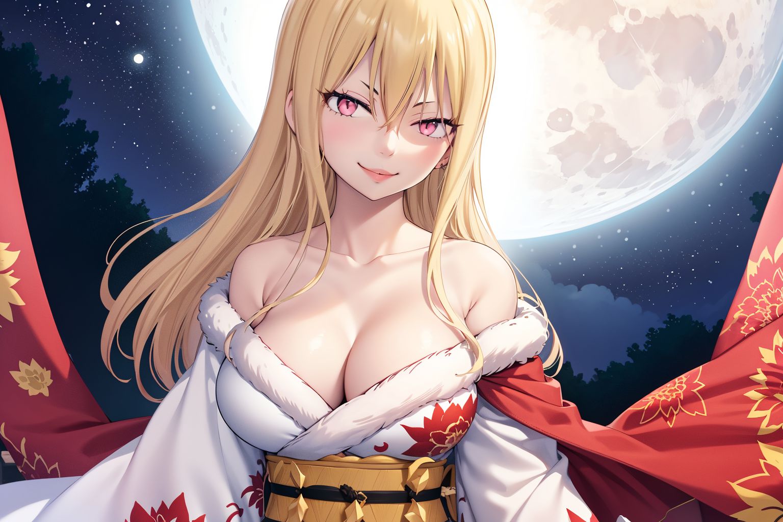 塞勒涅(妖精的尾巴)這張圖描繪了一輪滿月籠罩下的場景,月光灑滿大地,泛著藍綠色的光芒。畫面中心是一位金髮女子,她仰望著月亮。她穿著傳統的日式服裝,以白色為主色調,點綴著紅色和金色的裝飾。她的服裝包括一件束腰背心和一件長袖襯衫,更添傳統服飾的韻味。她手中握著一把紅色的扇子,在寧靜的藍綠色月光背景下格外醒目。畫面中沒有任何文字。物體的相對位置使女子成為視覺焦點,月亮作為背景,而她手中的紅色扇子則為整體構圖增添了色彩。