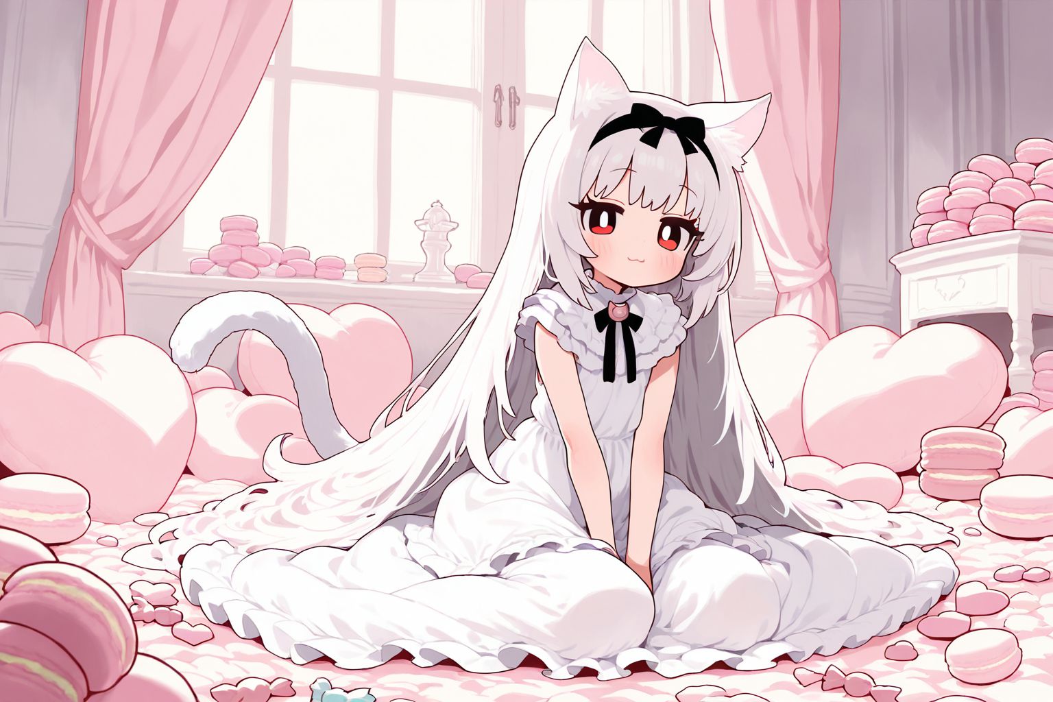 粉紅小女孩。這幅畫描繪了一個籠罩在柔和粉色調中的房間。畫面中央是一隻白色的貓,它有著黑色的耳朵和尾巴。貓咪戴著一個標有數字11的紅色項圈,坐在散落在地上的粉紅色愛心之中。畫面右側,一個白色的梳妝台靠牆而立。梳妝台上放著另一顆紅色愛心。梳妝台後面,一扇掛著窗簾的窗戶,透過窗戶可以看到外面的世界。貓咪的目光看向觀者,神情憂慮,彷彿察覺到這寧靜的環境中有什麼不對勁。儘管周圍環繞著許多愛心,這隻貓咪身上卻透著一絲孤獨,左側的空白處更突顯了這一點。這幅構圖簡潔的畫作,卻描繪出一幅色彩繽紛、情感飽滿的生動畫面。