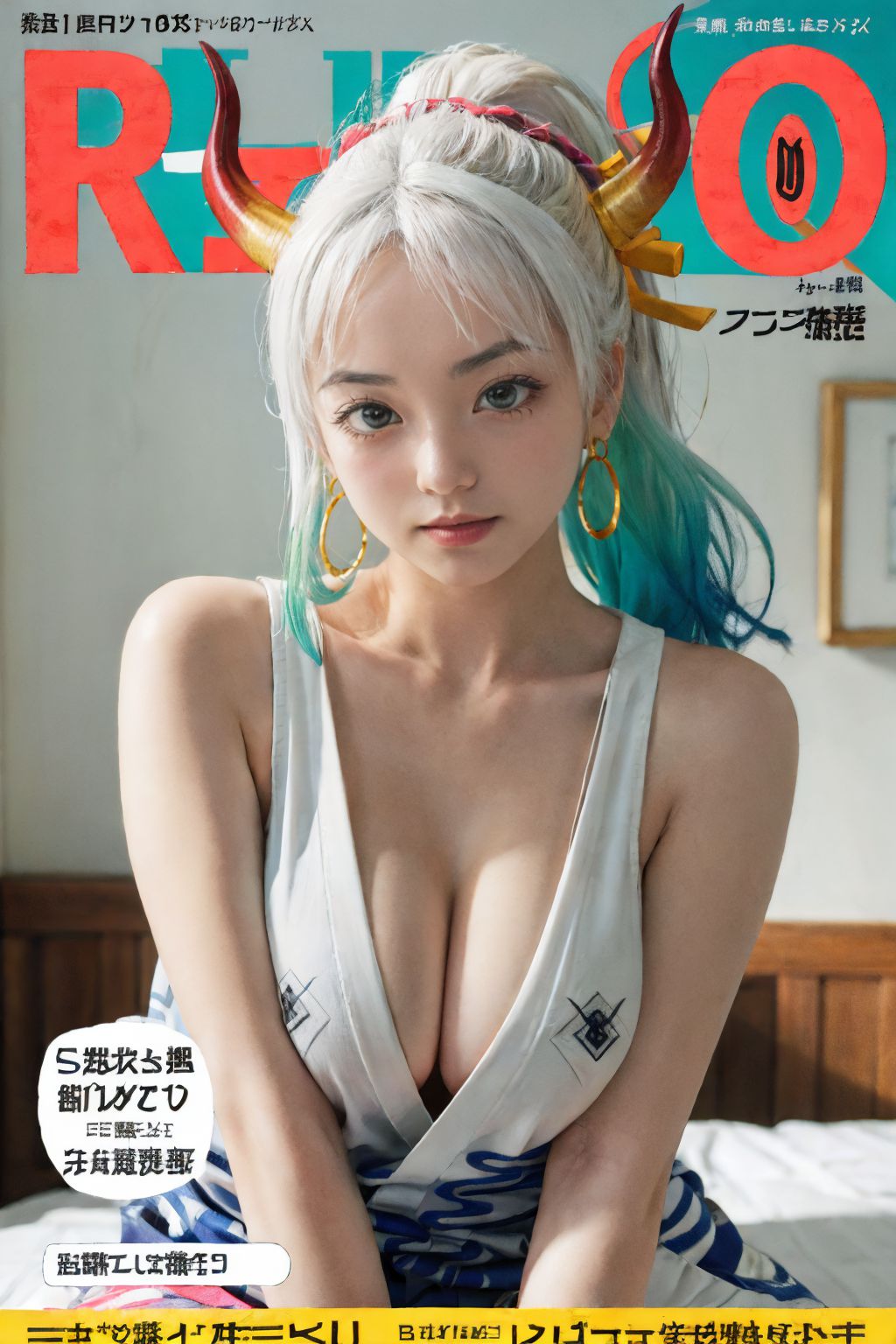 這張圖片是日本雜誌《RIO》的封面,日期為2014年11月。封面的主角是一位有著醒目藍色頭髮、頭戴紅色大角的女子。她身穿飾有黑色花卉圖案的白色連身裙,舒適地坐在畫面中央的床上。她的目光直視鏡頭,表情嚴肅,為整體構圖增添了一絲緊張感。雜誌名稱“RIO”和日期“11.2014”醒目地位於封面頂部,文字均為日文,表明了雜誌的出版地。除了這些元素之外,封面上還散佈著一些文字,可能是雜誌內文章的標題或預告。然而,從提供的圖片描述中無法辨認出這些文字的內容。封面的整體佈局展現出各個元素之間的巧妙平衡,每個部分都佔據著各自獨立的空間,同時又共同構成了一個和諧的整體。這位女子鮮豔的藍色頭髮與她的白色連身裙和紅色犄角形成鮮明對比,創造出引人注目的視覺效果,立即吸引了觀眾的注意力。