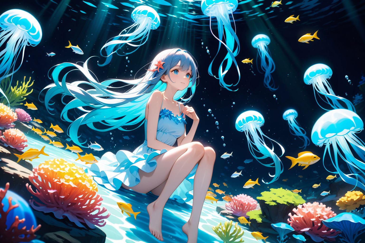 畫面中央,一位藍髮少女坐在岩石上,身穿藍色連身裙,戴著粉紅色花朵。她仰望著上方,黑色的天花板上點綴著藍色水母和黃色小魚。她腳下的海洋深藍如洗,珊瑚礁和氣泡點綴其間。畫面延伸至前景,可以看到一片珊瑚礁,藍橙相間的魚兒在珊瑚間游弋。畫面右側,一隻巨大的水母漂浮在水中,長長的觸手伸向上方漆黑的海面。少女在岩石上的姿態、她仰望的目光以及水下的景象,共同營造出一種奇妙而充滿探索的氛圍。畫面中沒有任何文字或其他物體。物體的相對位置與描述相符。