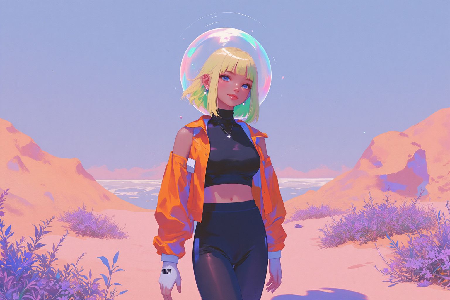 科技與末日 圖片中,一位金髮碧眼的女子站在沙灘上。她穿著黑色露臍上衣和藍色緊身褲,頭戴飾有藍紫色條紋的黃色太空人頭盔。她腳下的沙灘沙質細膩,點綴著矮小的灌木叢。頭頂是湛藍的天空,預告著陽光明媚的一天。遠處,橙色的山巒與周圍的景色形成鮮明的對比。女子似乎正處於沉思狀態,目光投向遠方,彷彿陷入了沉思,又或許正在觀察畫面之外的事物。整幅畫面給人一種冒險探索之感,太空人頭盔暗示著太空旅行或對天文學的興趣。