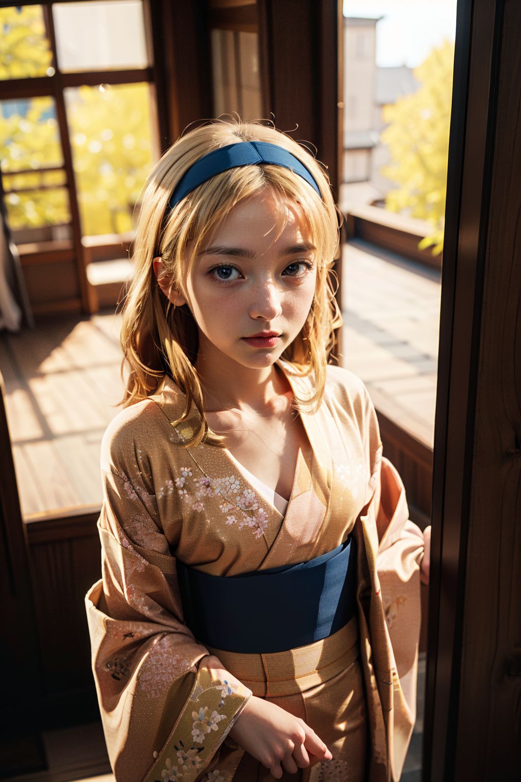 亞歷珊卓·波克雷甚金《勇敢的女巫》 照片中,一位金髮齊劉海的年輕女孩正靜靜地沉思。她穿著傳統的日本服飾,金色的和服與藍色的頭巾和肩上的藍色腰帶形成鮮明的對比,腰帶更添幾分優雅。她站在一扇敞開的門旁,身後的牆上掛著一面鏡子,映照出門外的寧靜花園。花園裡綠樹成蔭,藍天白雲,彷彿正值春夏時節。女孩的目光看向一旁,神情嚴肅,似乎陷入了沉思。她的姿態暗示著她即將步入花園,或許正準備享受門外那份寧靜的自然之美。整幅畫面描繪出一幅寧靜獨處、沉思冥想的景象。
