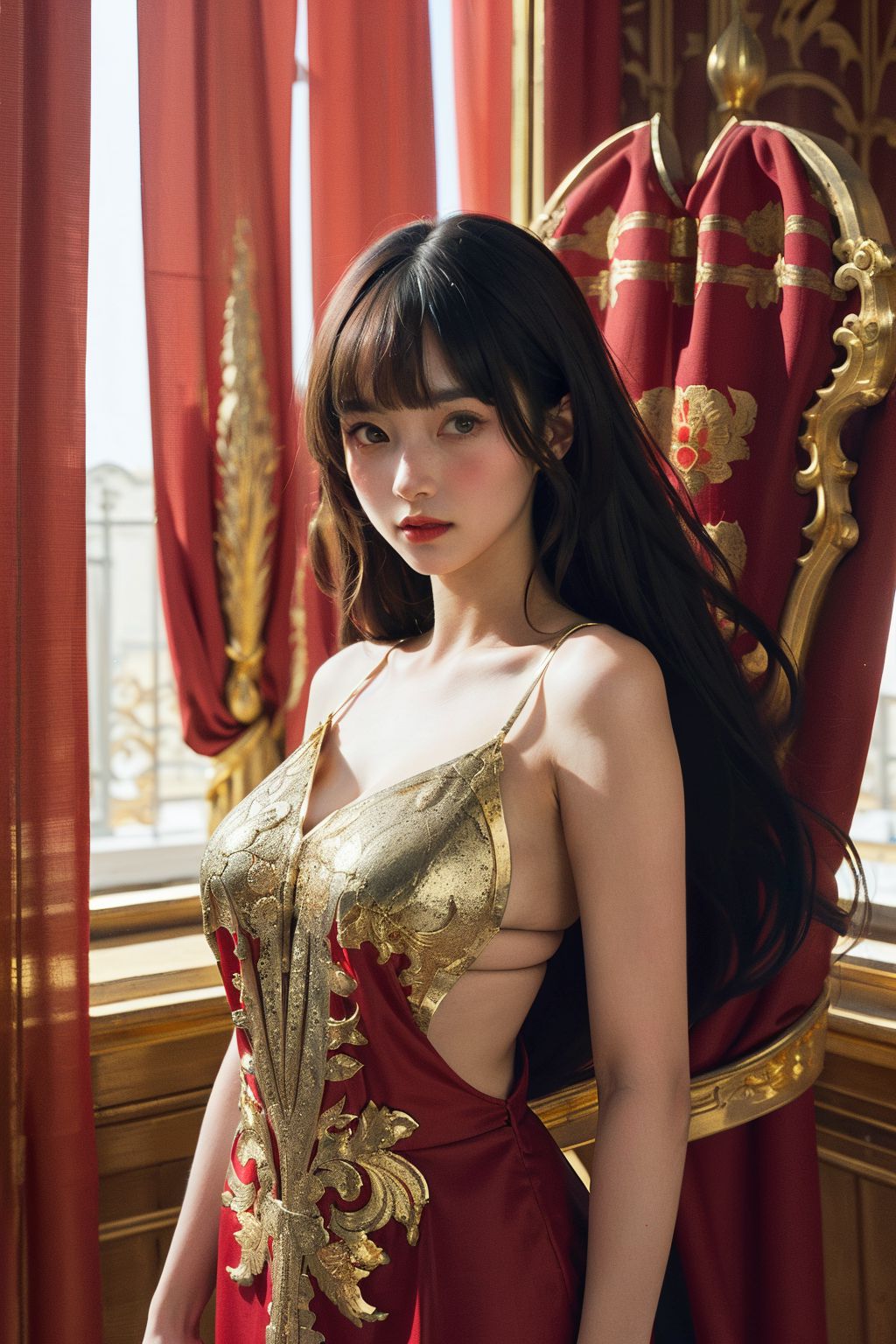 芭芭拉費爾頓,1960年代。在一間裝飾著紅色窗簾和金色鑲邊的房間中央,一位女士自信地站著。她烏黑的長髮如瀑布般傾瀉而下,與鮮豔的紅色連身裙形成鮮明的對比。這件洋裝引人注目,似乎是用絲綢或緞子製成的,深V領口更添幾分優雅。她手中拿著一把金扇,在這個場景中,這或許象徵著權威或地位。她的目光看向一旁,臉上帶著嚴肅的表情,暗示她正在沉思或全神貫注。房間本身裝潢華麗。牆壁漆成紅色,與她身後的窗簾顏色相呼應。金色的窗框勾勒出窗戶的輪廓,為整個場景增添了奢華感。這位女士在如此華麗的背景下,無疑是這幅畫面的焦點。她的服飾和手中的扇子暗示著某種文化背景或角色,但具體細節則留給觀者自行解讀。整體而言,這幅畫面捕捉了房間內一個被紅色和金色色調籠罩的瞬間,而女子則是畫面的中心人物。從她的衣著到表情,從她手中的扇子到她身後的窗戶,所有細節都共同營造出一個既賞心悅目又充滿敘事潛力的場景。