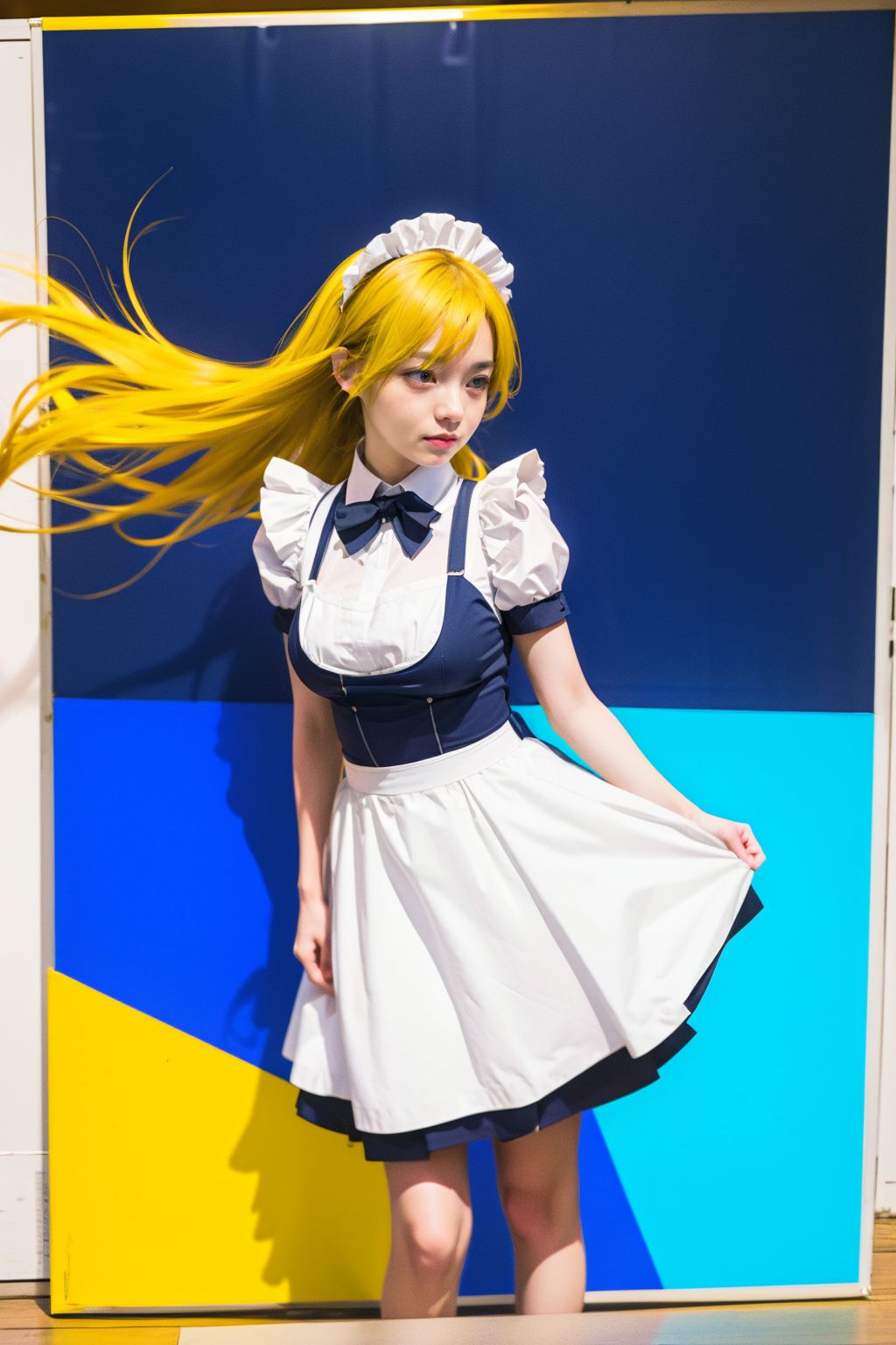 畫面中央,一位擁有亮麗黃髮的年輕女子邁著輕快的步伐,走過一面藍黃相間的牆壁。她穿著一件飾有藍色波點的迷人白色連身裙,搭配同色系藍色圍裙,與裙身形成鮮明的對比。裙擺略微外擴,為整體造型增添了一絲俏皮感。她頭戴一頂藍色軟帽,與黃髮相得益彰,更添幾分嫵媚。她手中撐著一把白色陽傘,這經典的配件為她的裝扮增添了一抹優雅。背景是一面醒目的藍色牆壁,上面有一條黃色條紋,為女子的旅程提供了色彩繽紛的襯托。這幅畫面定格了女子走過這片充滿活力的場景的瞬間。