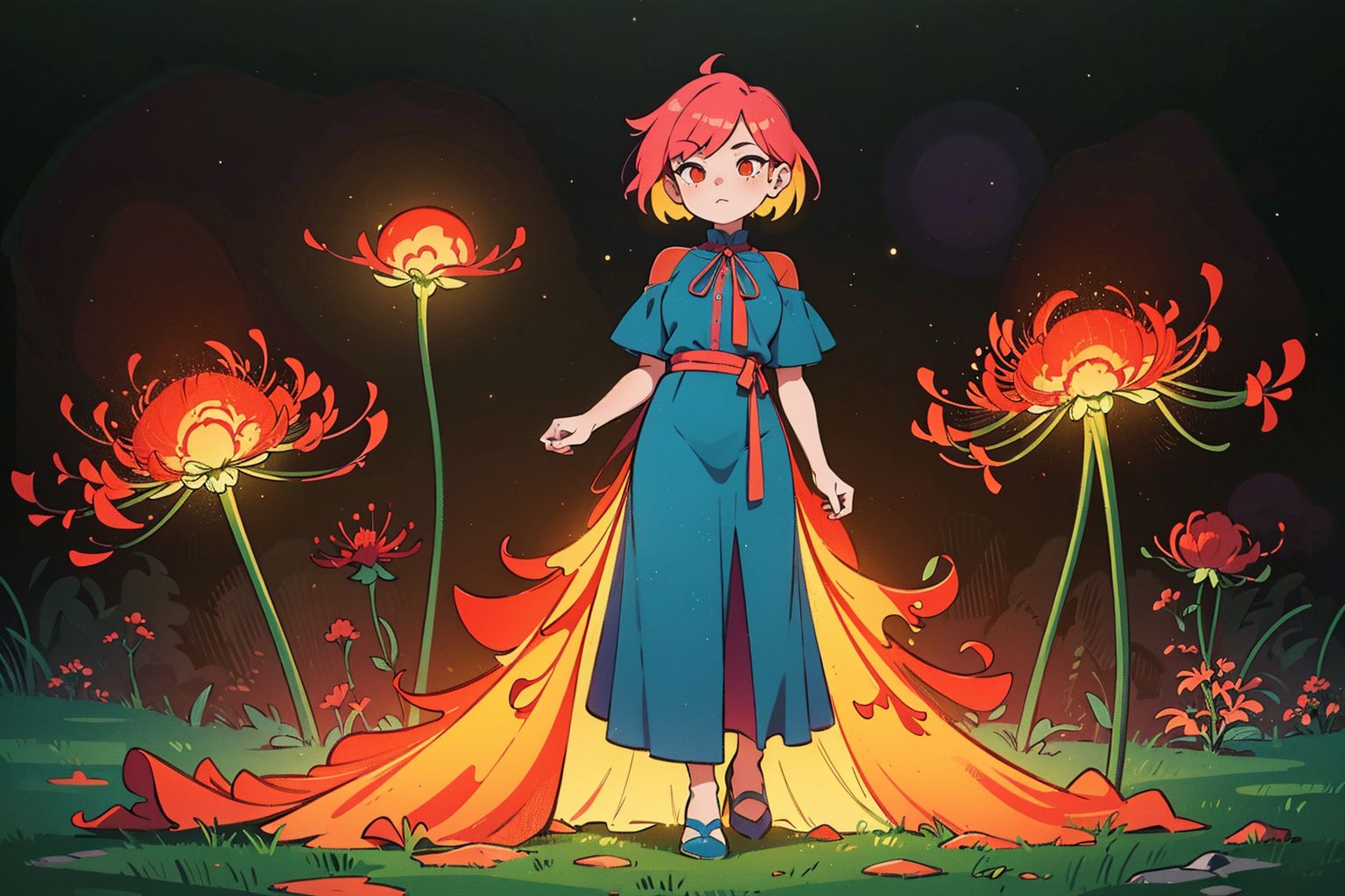 這幅彩色畫作展現了一幅寧靜而神秘的景象。畫面中央是一位有著醒目紅髮的少女。她穿著藍色長裙,與火紅的秀髮形成鮮明的對比。少女佇立於一片花海之中,花瓣上點綴著鮮豔的橘色和紅色。背景中,深邃的夜空為畫面營造出神秘的氛圍,繁星點點,更添幾分迷人氣息。遠處,三朵閃閃發光的蘑菇散發出空靈的光芒,進一步增強了畫面的神秘感。少女似乎正在移動,彷彿漫步於花海之中。她的姿態暗示著某種目的或目的地,儘管我們無法確定那究竟是什麼。整幅畫作的構圖建構了一個引人入勝的故事,引導觀者展開想像,展開自己的解讀。