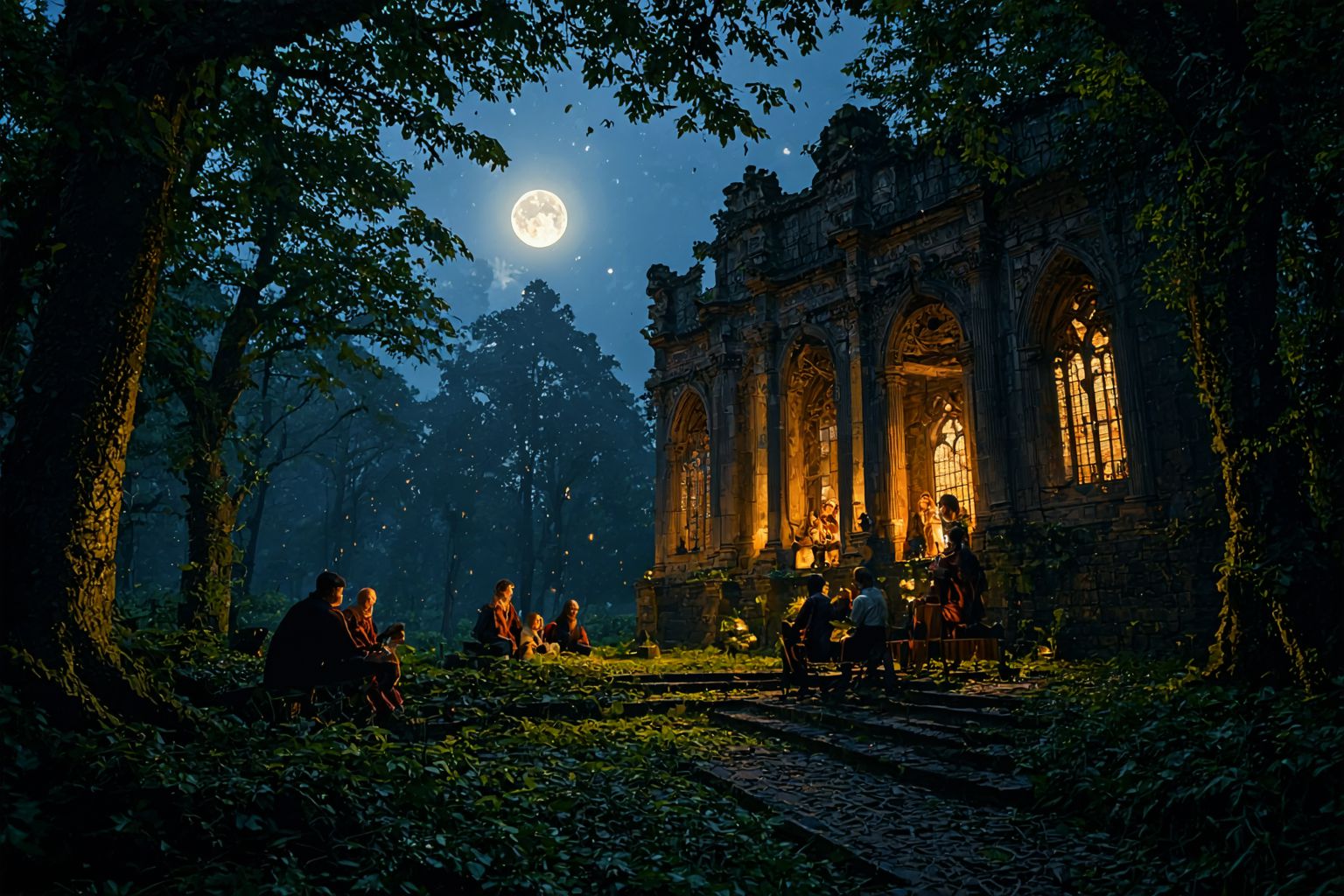 童話小屋,在靜謐的夜色中,一群人聚集在燭光搖曳的拱門旁。拱門雄偉壯麗,設計精巧,多盞光源交相輝映,溫暖的光芒灑在周圍人們的臉上。夜空晴朗,明月高懸,遠處傳來貓頭鷹的鳴叫,更添幾分寧靜。從背景中的樹木和灌木叢可以看出,聚會似乎是在公園或花園中進行的。這張照片以低角度拍攝,讓拱門和周圍的人們顯得格外高大。