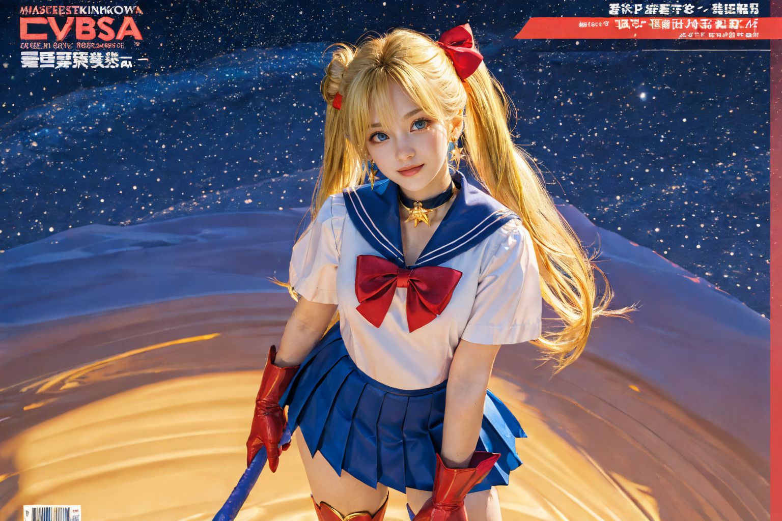 在《美少女戰士》的這張圖中,一位金髮少女站在一個類似月球表面的表面上。她穿著藍白相間的水手服,戴著紅色手套,頭上也繫著一個與之相配的紅色蝴蝶結。她的左手握著一根藍色的權杖。背景是繁星點點的藍天,營造出一種置身外太空的錯覺。圖片右上角用日文寫著“D-Style SAILOR”,意為“你好嗎?D-Style SAILOR”。少女似乎正凝視著遠方,彷彿在凝視著畫面之外的某個地方。整幅畫面的構圖賦予了它一種超現實的夢幻感。