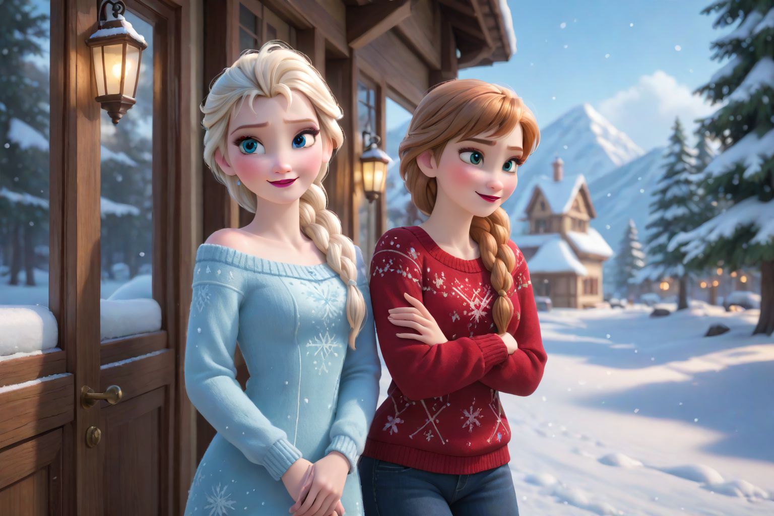 圖中,兩個動畫玩偶站在一棟木門木窗的建築物外。左邊的玩偶穿著飾有白色雪花的藍色連身裙,右邊的玩偶穿著飾有白色雪花的紅色毛衣。她們並排站著,面向前方,雙手交叉抱在胸前。在她們身後,是一棟尖頂木屋,以及一片白雪皚皚、樹木點綴的景色,天空湛藍清澈。玩偶們似乎身處寒冷的環境中,從她們衣服上的雪花和身後的雪景來看,可能正值冬季。圖片中沒有任何文字。