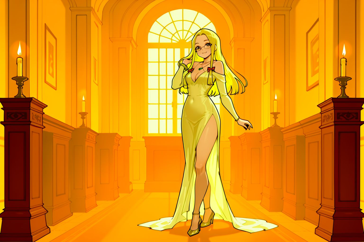 一位擁有秘密的情婦,在一間沐浴著暖黃色燈光的宏偉房間中央,一位女子端坐在白色平台上。她身著一襲金色長裙,裙擺如瀑布般垂至腳踝,閃耀著金色的光芒,與房間的色調交相輝映。她雙臂伸展,彷彿正在表演或做出某種手勢。房間本身裝潢華麗,高高的天花板上懸掛著璀璨的水晶吊燈,燈光在空中交織,灑落在房間各處。牆壁並非空無一物,而是裝飾著精美的畫作,更添畫面的奢華。儘管周圍環境富麗堂皇,但女子依然是畫面的焦點,她的存在感主導著整個場景。畫面中沒有任何文字,讓觀者能完全沉浸在視覺敘事中。物體的相對位置和細節都被一絲不苟地捕捉,生動地展現了這一刻被凝固的瞬間。