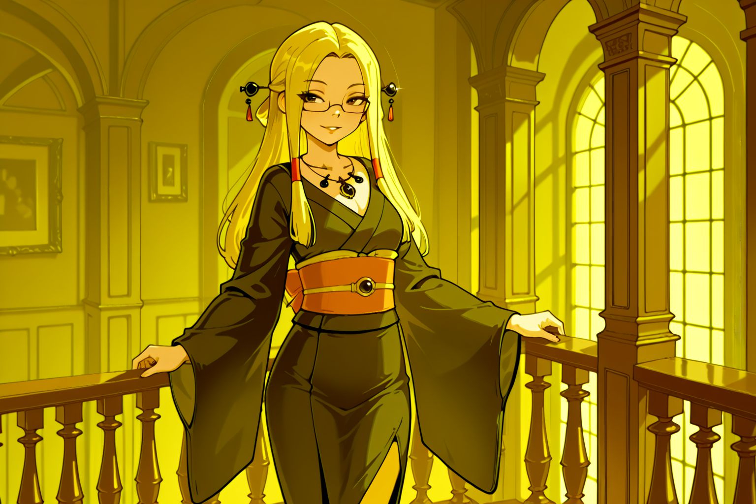 這位擁有秘密的情婦,畫面描繪了一位卡通女子站在陽台上的場景。她有著金色長髮,身穿黑色連身裙,腰間繫著一條橘色腰帶。她左手拿著一把扇子,右手輕輕搭在陽台的欄桿上。陽台地面是黃色的,欄桿是白色的,並以紅色點綴。陽台外的背景是一間房間,裡面擺放著一張桌子和一扇窗戶,分別以黃色和橙色呈現。儘管色彩簡潔——主要由黑色、橙色和白色組成——但透過描繪女子與她家的背景,畫面傳遞出一種寧靜優雅的氣息。物品和女子的精準擺放暗示著一個井然有序的空間,增強了畫面的整體美感。畫面中沒有任何可辨識的文字。
