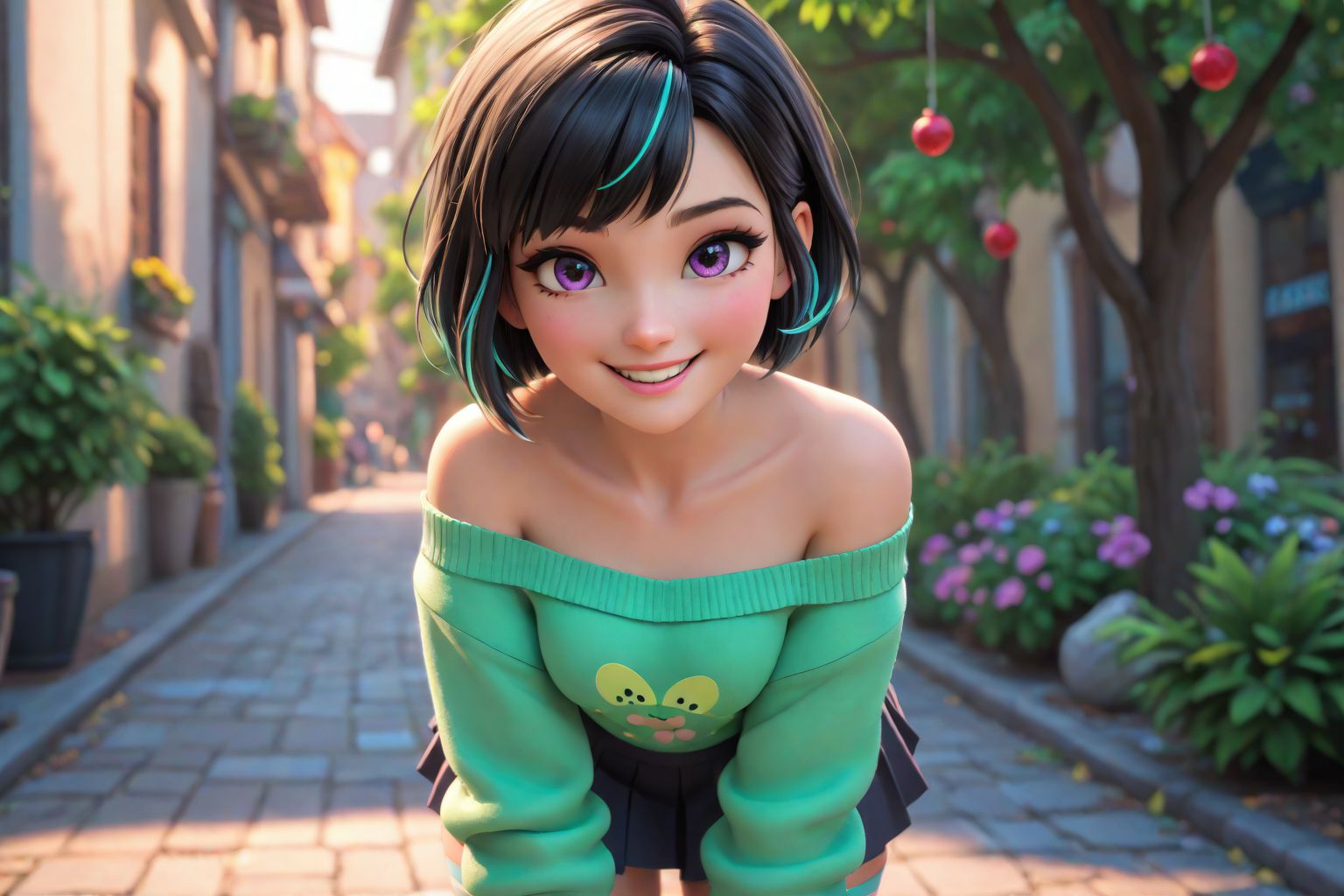 這張名為《無敵破壞王》中的雲妮洛普·馮·史威茲的圖片捕捉到了一個迷人的場景:一位年輕女孩臉上化著動漫風格的妝容,一頭黑髮挑染著醒目的藍色。她穿著一件鮮豔的綠色連身裙,胸前印著一隻活潑的青蛙圖案,為整體造型增添了一絲奇趣。她跪在鵝卵石街道上,目光直視鏡頭。她燦爛的笑容散發著溫暖的氣息,顯然心情愉悅。背景中的樹木和建築進一步增強了畫面的氛圍,雖然細節略顯模糊,但依然為畫面增添了色彩。女孩在鵝卵石街道上的姿勢,加上她的裝扮和表情,營造出一種期待感,彷彿在等待著什麼激動人心的事情發生。這張圖片細節豐富,每個元素都經過精心安排,構成了一幅和諧的畫面,講述了一個超越語言的故事。