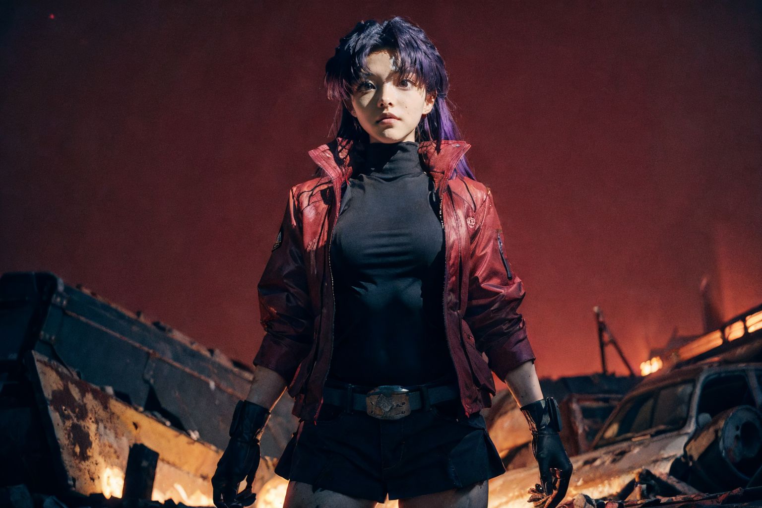 葛城美里,《新世紀福音戰士》。圖中,一位黑髮年輕女子站在屋頂上。她穿著一件鮮豔的紅色外套,與黑色襯衫和褲子形成鮮明對比。她站姿堅定,雙腳與肩同寬,雙手叉腰。她身後的城市景觀籠罩在黑暗中,但遠處建築物的微弱燈光暗示著夜幕降臨。在她右側,屋頂上散落著一堆瓦礫和碎片。儘管周圍一片混亂,她依然在畫面中格外引人注目。圖中沒有任何文字,所有物體都靜止不動,顯示在可能動盪不安的局勢中,此刻卻一片寧靜。女子相對於城市景觀的位置表明她身處相當高的地方,這更增添了畫面的戲劇性和緊張感。