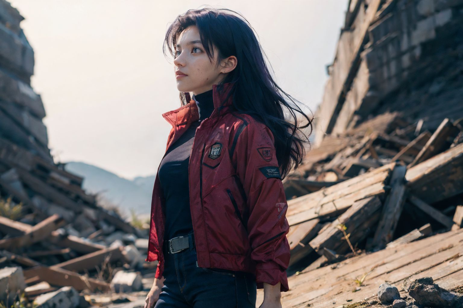 葛城美里,《新世紀福音戰士》。圖中,演員克里斯滕·里特飾演電視劇《良善之地》中的貝絲·博蘭。她站在一堆瓦礫和碎片上,目光看向一旁。她穿著一件飾有「格林」和「北極熊」字樣徽章的紅色外套,手中輕柔地握著一個小物件。黑色長髮垂落在臉頰兩側,她若有所思地望著畫面之外的某個地方。背景是湛藍的天空與遠處連綿的山脈,為整個畫面增添了意境。