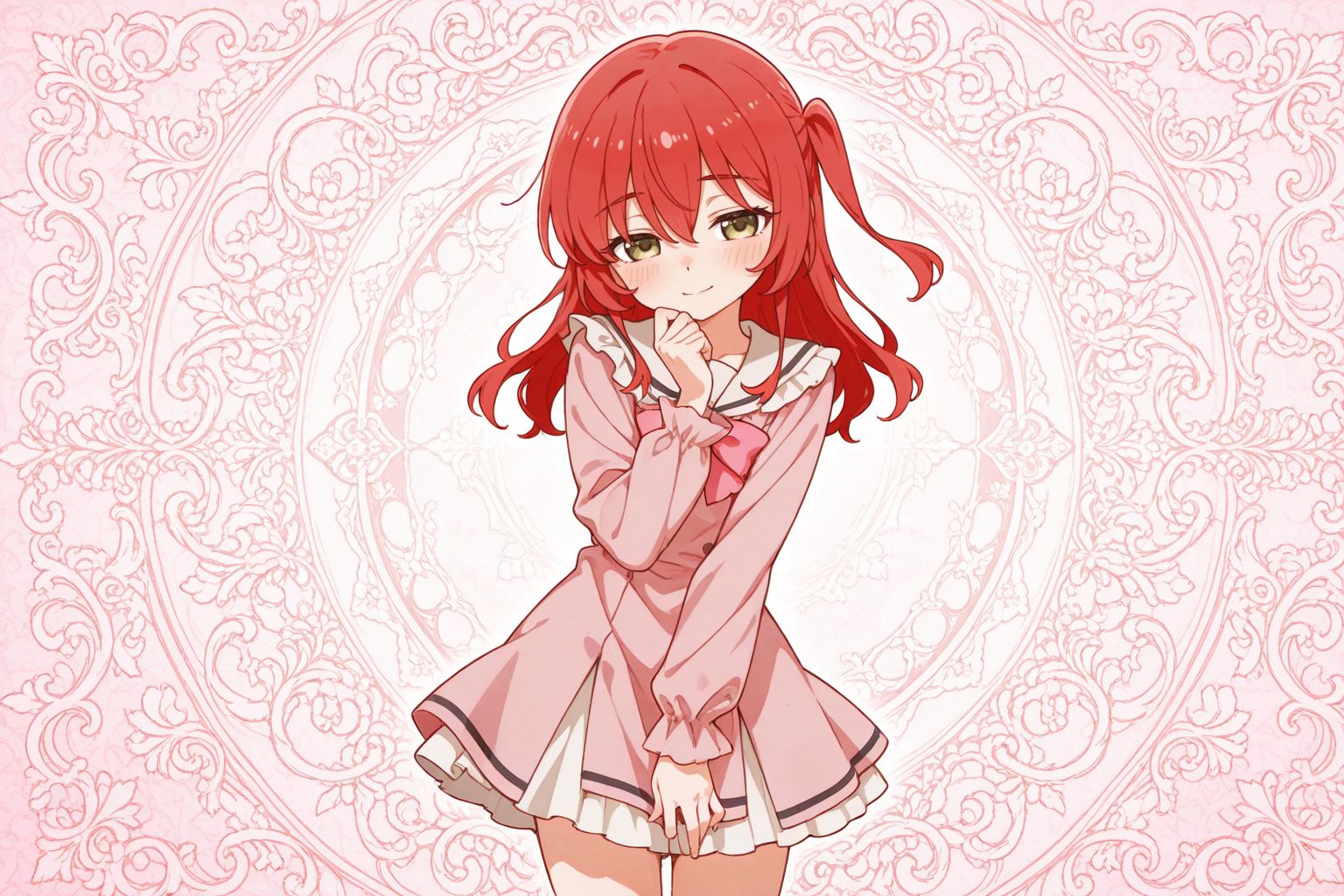 畫面中央,一位有著鮮豔紅髮的年輕女孩映入眼簾。她穿著粉紅色連身裙,領口和裙子飾以白色荷葉邊,更添幾分優雅。女孩自信地站著,雙手叉腰,目光投向畫面之外。淺粉紅色的背景與女孩形成鮮明對比。但這並非普通的背景——它以白色和金色的花卉圖案環繞著女孩,更加凸顯了她在畫面中的存在感。整個畫面籠罩在柔和的光暈中,營造出一種近乎空靈的氛圍。從她醒目的紅髮到自信的姿態,再到精心設計的背景,畫面中的每個元素都完美融合,共同構成了一幅引人入勝的年輕女孩肖像。這是一張講述故事的快照,引發人們對她是誰以及她所代表的意義的好奇。