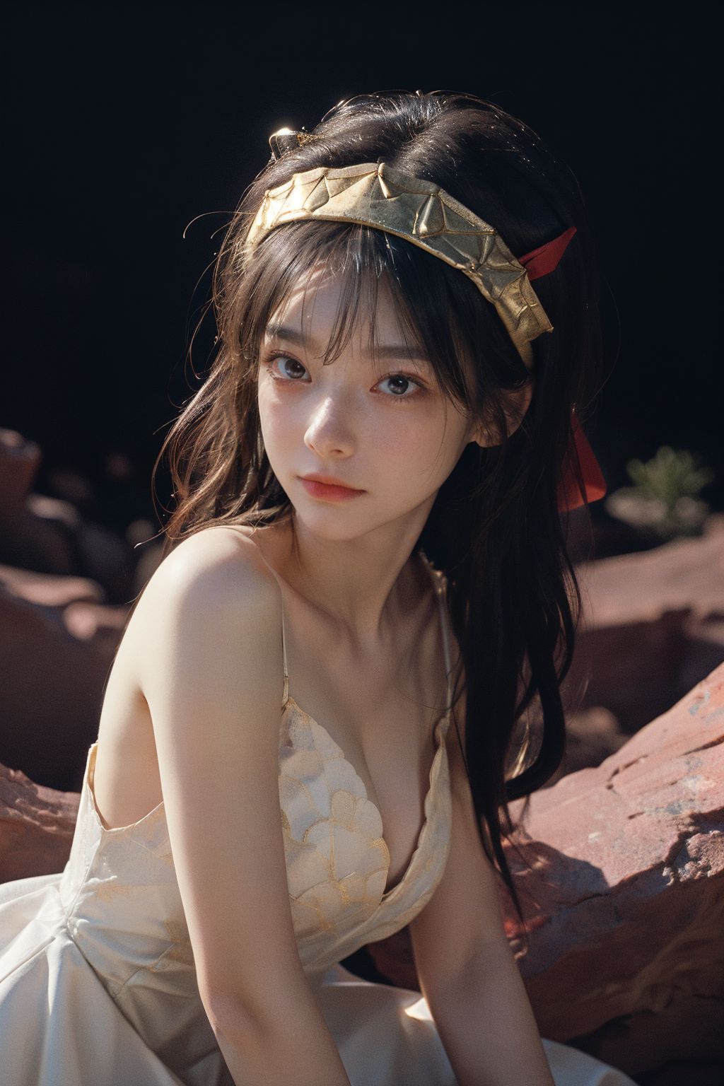 照片中,一位年輕女子坐在一塊紅褐色的岩石上。她身穿白色長裙,與她烏黑的長髮形成鮮明對比,長髮自然地披散著。一條飾有紅色花朵的金色髮帶,更添幾分優雅。她的目光看向一旁,似乎正在沉思或遐想。她神態安詳,進一步增強了畫面的寧靜氛圍。背景雖然模糊,但隱約可見花園或公園的景色,為這幅肖像畫營造了一種自然而靜謐的氛圍。整幅照片的構圖和諧統一,色彩、質感和氛圍完美融合。