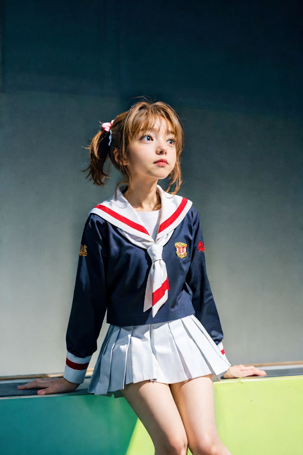 出自Nelvana的《櫻花阿瓦隆》系列作品。圖中,一位留著及肩棕色長髮的年輕女孩是畫面的中心人物。她身穿藍白相間的水手服,頭上繫著紅色蝴蝶結,為整體造型增添了一抹亮色。她自信地站在明亮的黃色牆面前,與她的裝扮形成鮮明的對比。女孩的目光看向一旁,似乎在沉思,或許正沉浸在畫面之外的某件事。她臉上帶著一絲微笑,流露出滿足或遐想的神情。她的左臂隨意地搭在藍色的欄桿上,更增添了畫面輕鬆愜意的氣氛。畫面沒有任何文字。物體之間的相對位置和互動,生動地描繪出一個被定格的瞬間。