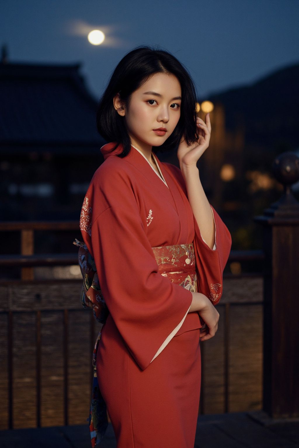 照片中,一位年輕女子站在陽台上,時間似乎在夜晚。她穿著一件傳統的日本和服,紅色底色,飾以金色點綴。女子抬手放在耳邊,似乎用手機通話,但手機畫面中並未顯示。照片背景中可以看到木質欄桿和石牆,顯示陽台是由這些材料建造的。陽台外,一棟屋頂呈現弧形的建築映入眼簾,為畫面增添了建築特色。夜空中一輪明月高懸,為整個場景營造出寧靜祥和的氛圍。畫面中沒有任何可辨識的文字或可計數的物體。女子相對於陽台和建築的位置表明,她可能正在一邊欣賞月光下的夜空,一邊進行電話交談。這張照片捕捉了女子在傳統日本建築背景下靜謐沉思的瞬間。