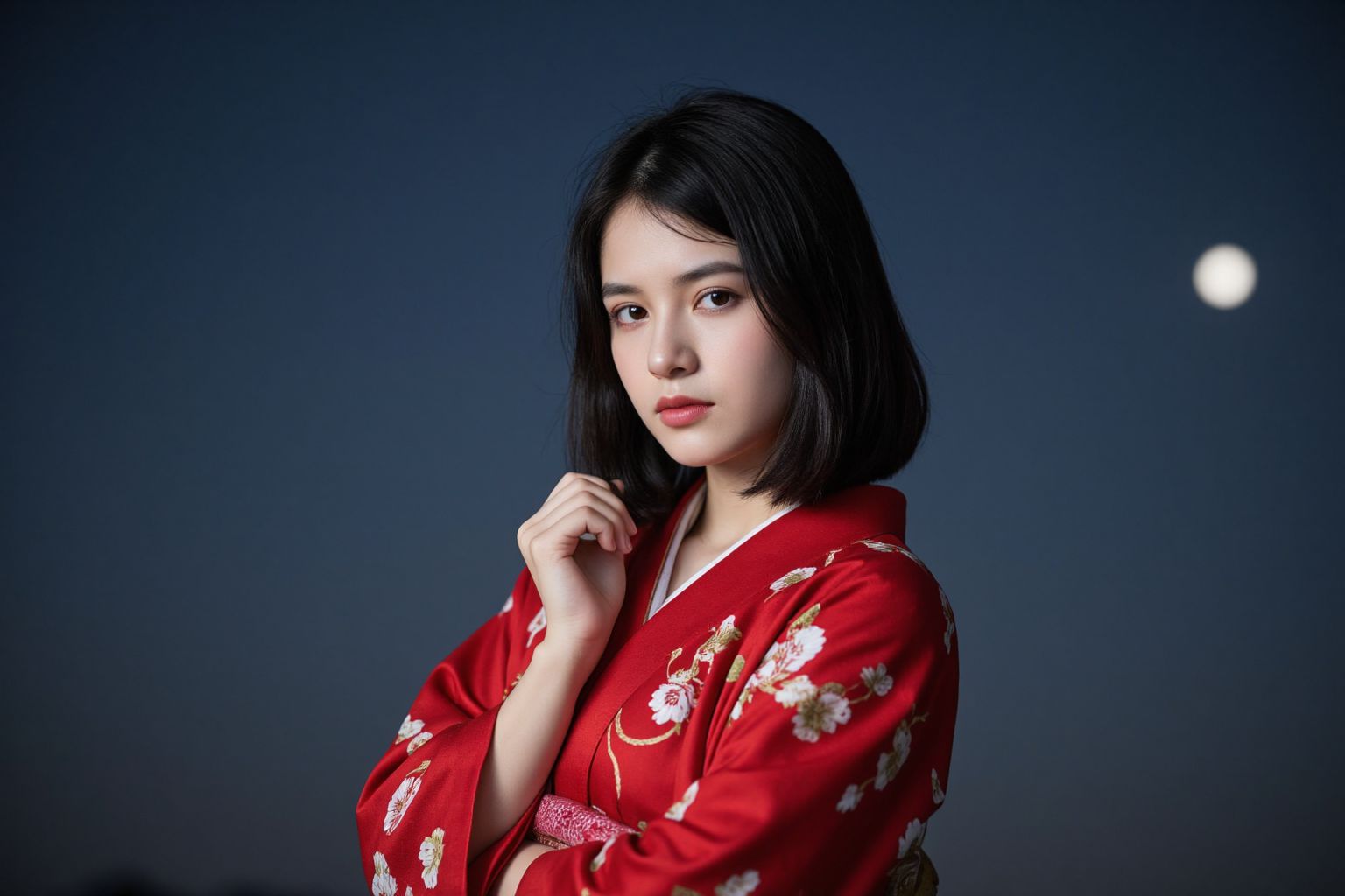 畫面中心,一位年輕女子穿著傳統日式和服,鮮豔的紅色底色點綴著精緻的白色花卉圖案,展現出優雅氣質。和服輕柔地披在她身上,與房間深藍色背景形成對比。她左手輕輕托著下巴,目光投向遠方,臉上帶著沉思的神情。她位於畫面中央,立刻吸引了我們的目光,成為這幅作品的焦點。畫面右上角,一輪皎潔的明月懸掛在夜空中。月亮的純白與深藍色背景形成鮮明對比,為畫面增添了一絲神秘感。月亮的位置暗示著它高懸於女子頭頂的夜空。房間一片漆黑,只有一盞燈照亮了女子,在她身上投下柔和的光暈。這樣的光線襯托出她和服的色彩,也突顯了她沉思的神情。整體而言,這張照片捕捉了她在對比鮮明的色彩和元素背景下,靜靜沉思的瞬間。畫面中物體的精準佈局,營造出光影、色彩與對比的和諧平衡。這是一張定格在寧靜時刻的快照。