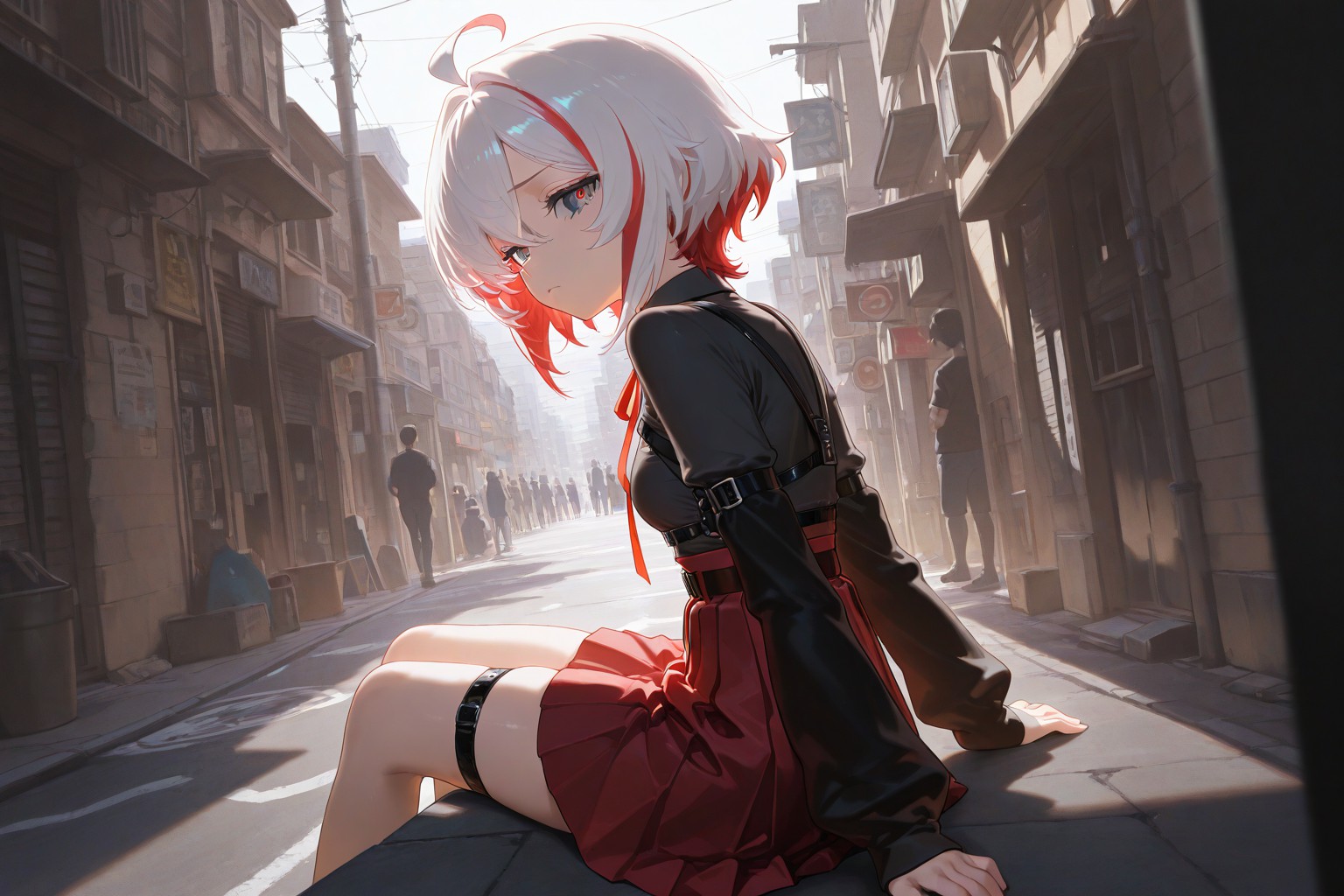 白星公主妮莉多,在熙熙攘攘的城市中心,一位有著鮮豔紅髮的少女獨自坐在石牆邊,享受著片刻寧靜。她身穿黑色外套和粉紅色連身裙,與周圍的都市景象形成鮮明的對比。她盤腿而坐,目光低垂,陷入沉思,雙腿隨意地懸在牆邊。周圍的城市生氣勃勃,高樓林立,窗戶反射著溫暖的陽光。電線縱橫交錯,在湛藍的天空下構成了一張錯綜複雜的網。陽光燦爛,在地面上投下長長的影子,金色的光芒照亮了整個場景。儘管身處都市喧囂之中,她卻散發著一種寧靜的氣息。她彷彿置身於自己的世界,對周遭的熙攘喧囂渾然不覺。彷彿在都市生活的混亂中,她找到了一片難得的寧靜。這張照片完美地捕捉到了這種對比——女孩寧靜的孤獨與充滿活力的城市景觀形成鮮明對比。
