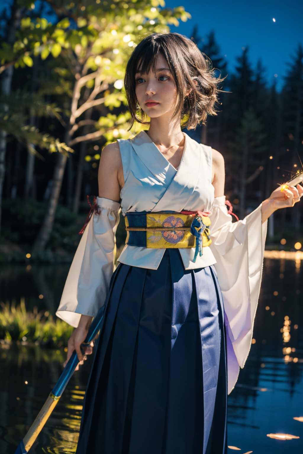 FF X,yuna,在寧靜的湖畔,一位女子儀態端莊,蓄勢待發。她身著傳統的韓服,散發著優雅寧靜的氣息。韓服以藍白相間的圖案為主,胸前點綴著一朵鮮豔的黃色花朵,為原本單調的服飾增添了一抹亮色。一條藍色腰帶束在腰間,與從長袍下露出的白色襯衫相得益彰。她右手握著一根木棍,或許象徵著力量,或許是指引方向的工具。她的目光投向湖面,流露出平和寧靜之感。遠處樹木蔥鬱,微風輕拂,樹葉沙沙作響,一座小島點綴著平靜的湖面。天空晴朗,顯示此刻是清晨或傍晚。遠處幾顆星星閃爍著微弱的光芒,在湖面上投下柔和的光暈。這張照片捕捉的不僅僅是一個瞬間,而是一整套關於寧靜與自然和諧的故事。