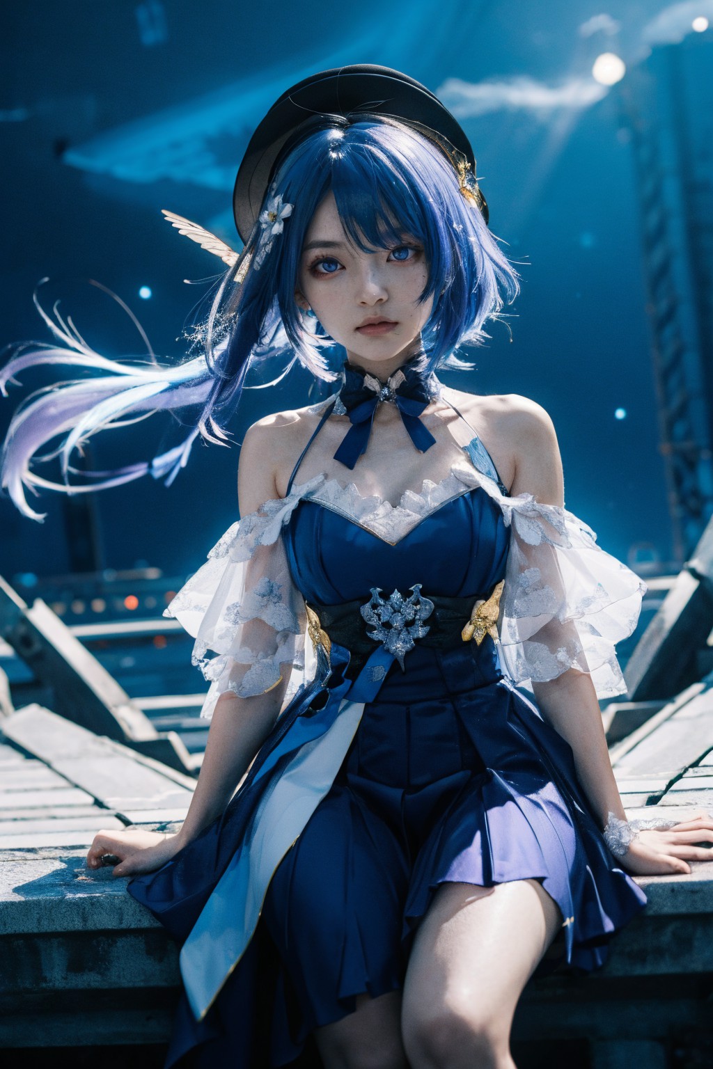 在格里塞奧·霍恩卡(Griseo, Honka)作品中,畫面中央是一位有著亮藍色頭髮、身著同色系服裝的年輕女孩,她是畫面的主角。她的裝扮十分精緻,藍色洋裝的袖口和下擺都飾有白色蕾絲花邊。一條金色項鍊為她的整體造型增添了一絲優雅。她左手拿著一個藍色羽毛飾品,與她的服裝相得益彰。她坐在黑色長椅上,身後是深藍色背景,與她鮮豔的色彩形成鮮明對比。女孩的目光直視鏡頭,顯示她知道自己正在被拍攝。她的姿態和表情展現出自信和沈穩的氣質。畫面中沒有任何明顯的文字或其他物體。女孩、長椅和背景的相對位置構成了一個和諧的圖像。
