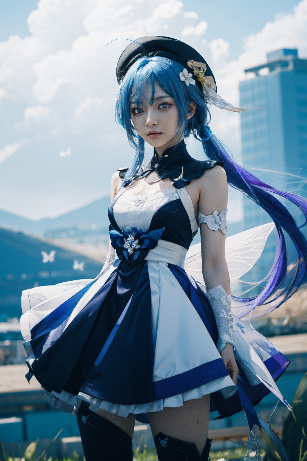在格里塞奧·霍恩卡(Griseo, Honka)的作品中,一位年輕女子是畫面的中心人物,她站在一片湛藍的天空下,天空點綴著朵朵白雲。她穿著一件鮮豔的藍白連身裙,與她同樣是藍色的長髮形成鮮明的對比,長髮上戴著黑色髮帶。一雙黑色靴子為她的裝扮增添了一絲個性。女子的目光向上,彷彿沉浸在浩瀚的天空中,或許在思考畫面之外的事物。背景中,兩隻鳥在空中飛翔,它們的輪廓在天空的映襯下格外醒目,為這片寧靜的景象注入了一絲動感。更遠處,可以看到一座藍色外牆的建築,其顏色與女子的裙子和頭髮相呼應。畫面中沒有任何文字或可辨識的符號,只聚焦在女子及其周圍的環境。物體之間的相對位置暗示著這是一個戶外場景,考慮到畫面中出現的自然元素,很可能是在公園或花園裡。整體而言,這幅畫面捕捉了一個寧靜而沉思的瞬間,女性是畫面的核心。色彩、物品及其佈置營造出和諧的構圖,既賞心悅目又引人入勝。