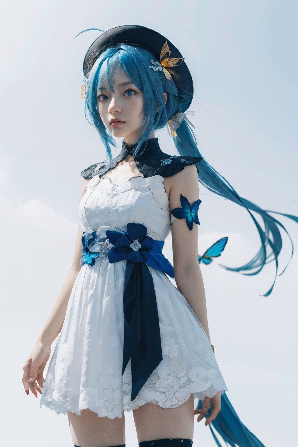 在格里塞奧·霍恩卡(Griseo, Honka)作品中,一位年輕女子自信地佇立在湛藍的天空和蓬鬆的白雲之間。她穿著一套色彩鮮豔的白色連身裙,點綴著藍色和黑色的裝飾。裙子飄逸,為她的姿態增添了一絲動感。她一頭醒目的藍色秀髮如瀑布般傾瀉而下,與她明亮的藍色眼眸相得益彰。她的目光直視鏡頭,與觀者產生直接的互動。為了增添一絲俏皮,她頭戴一頂飾有金色花朵的黑色帽子。這朵小花不僅點綴了畫面,也成為了視覺焦點。在她肩頭兩側,蝴蝶翩翩起舞,彷彿被定格在飛翔的瞬間。這些元素的巧妙佈局,使畫面呈現出一種平衡之美。儘管畫面簡潔,卻散發出一種寧靜優雅的氣息。