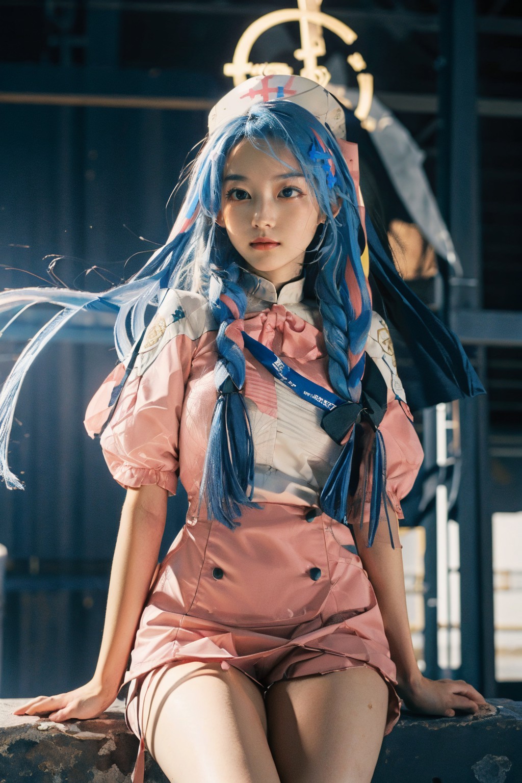 青森峰,《藍色檔案》。畫面中央,一位藍髮年輕女子倚靠水泥階梯。她身穿粉紅色連身裙,與髮色形成鮮明對比,頭戴白色帽子。在她身後,一棟建築巍然聳立,外牆上裝飾著巨大的錨形標誌。天空湛藍清澈,點綴著幾朵白雲。儘管周圍環境細節豐富,但畫面中最引人注目的卻是這位女子。