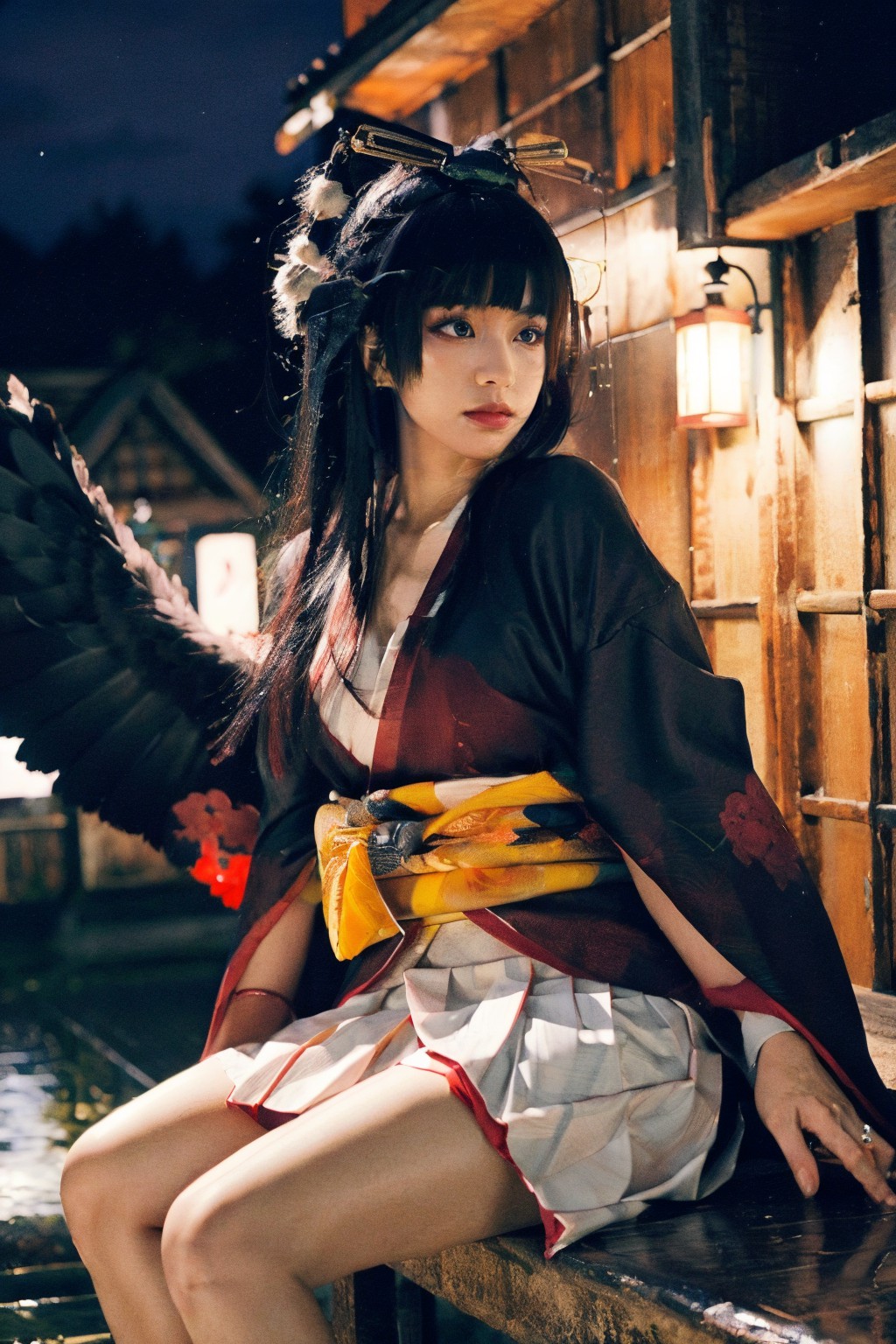 女天狗(Nyotengu)傳統畫作,生死皆宜。畫面中心是一位長髮飄飄的年輕女子,身穿以黑紅為主色調的傳統日式和服。腰間繫著一條名為「腰帶」(obi)的黃色腰帶,為她的裝束增添了一抹亮色。她端坐在木凳上,質樸的木凳與她鮮豔的服飾形成鮮明對比。她雙腿交疊,姿態放鬆,一手輕輕搭在大腿上。這樣的姿態散發出優雅而沉穩的氣質。在她身後,一盞燈亮著,散發出溫暖的光芒。燈光照亮了背景,背景是一座木質建築和其他木製物件。這幅畫與背景相映成趣,營造出一種文化與傳統的和諧融合。女子神情嚴肅,目光看向一旁,或許在沉思,或許只是在享受當下。整幅畫的構圖給人一種寧靜祥和感,也表達了對文化傳統的尊重。