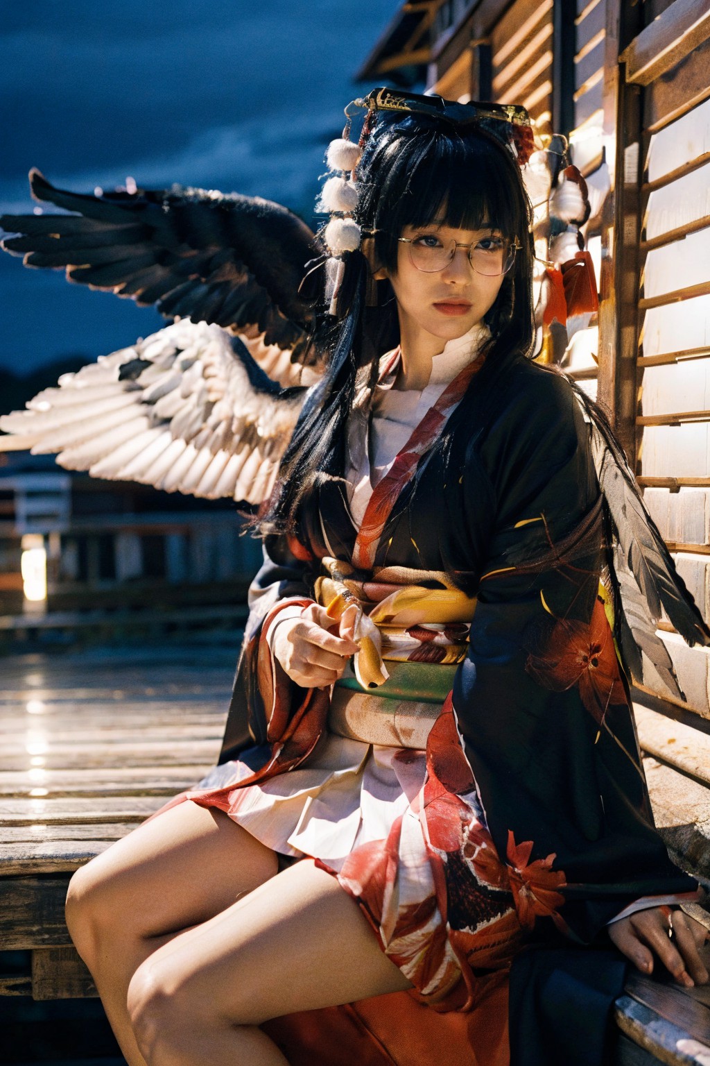 女天狗(Nyotengu)傳統畫作,生死皆有定數。在寧靜祥和的環境中,一位長髮披肩的年輕女子端坐在木凳上。她戴著眼鏡,身穿飾有鮮豔紅白花卉圖案的傳統日式和服。腰間繫著一條醒目的黑金腰帶,更添幾分優雅。她所坐的木凳與柔美的和服形成鮮明對比,木質的質感在瓦頂建築的襯托下格外醒目。遠處隱約可見的鳥籠,暗示著畫面之外的室內空間。她手中握著一件小物件——或許是一件精緻的飾品,又或許是一件意義非凡的信物——為這幅引人入勝的畫面增添了一絲神秘感。她的目光看向一旁,似乎正在沉思冥想。整個場景展現出寧靜內省、文化底蘊深厚的畫面。